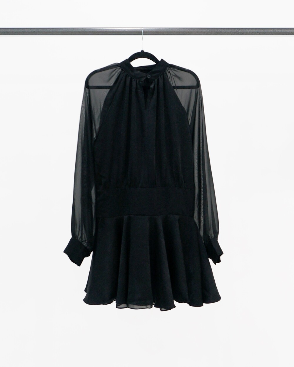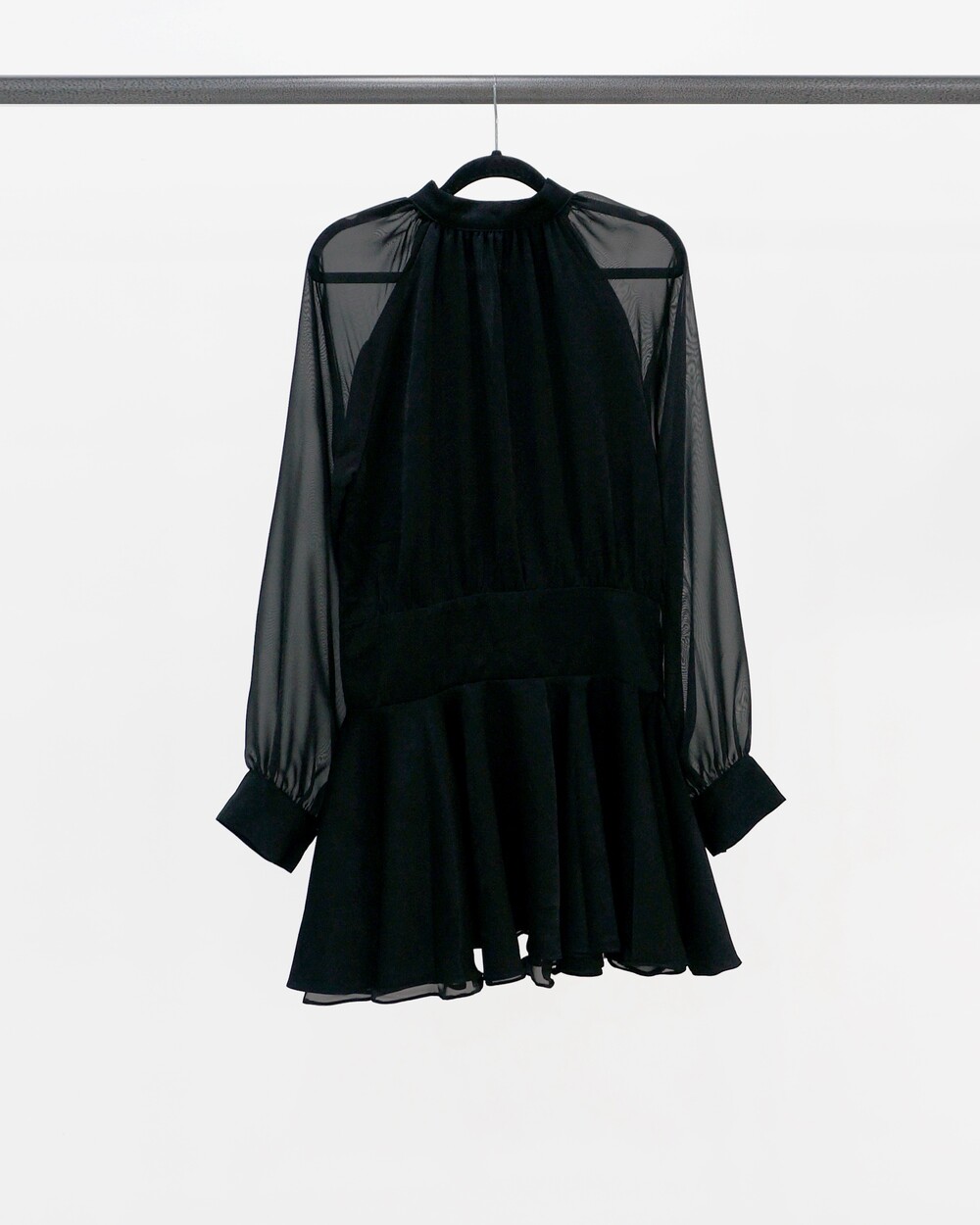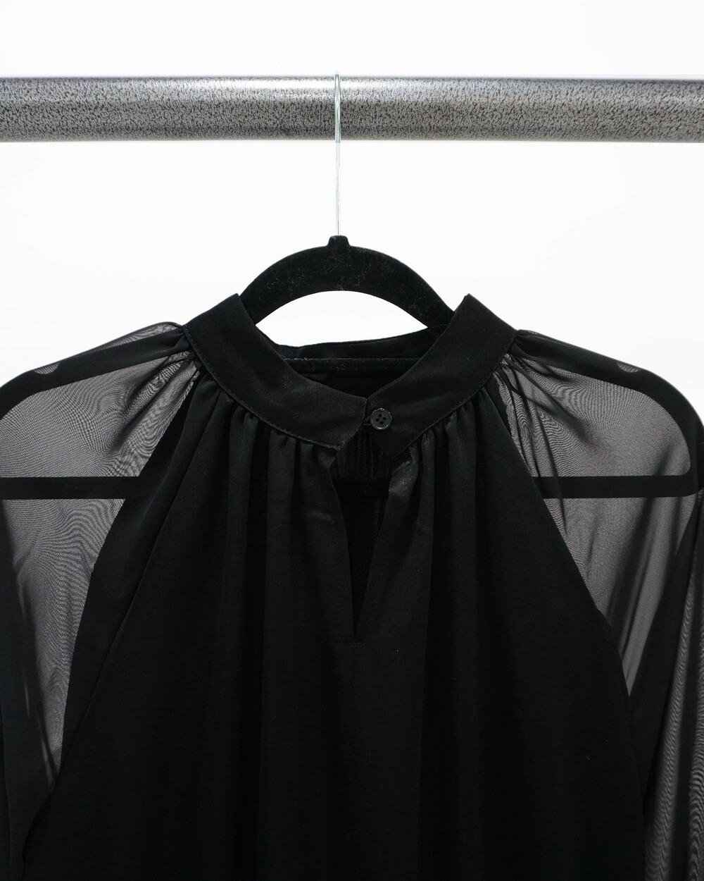 - 새틴질감의 몸통, 쉬폰 소재의 소매.