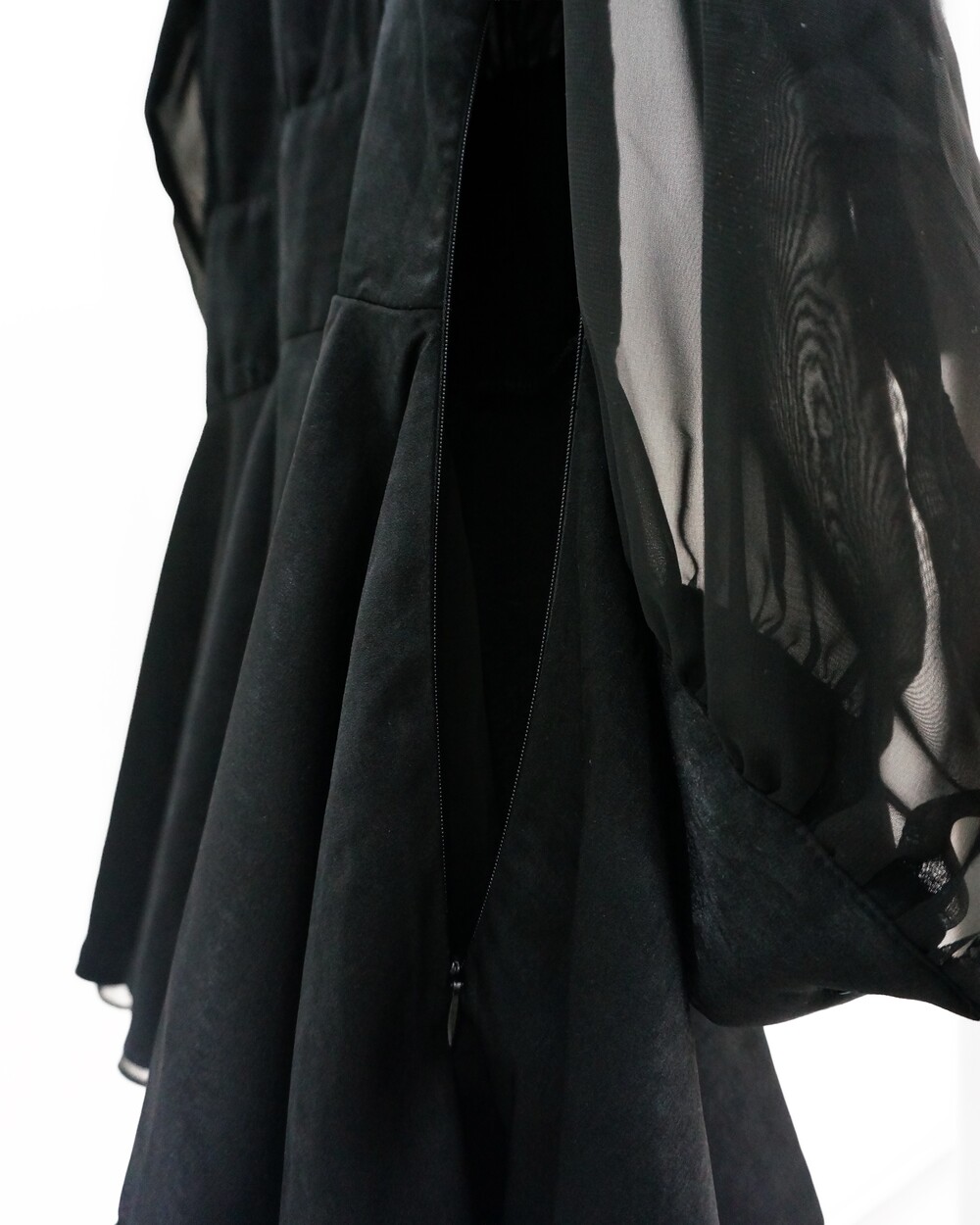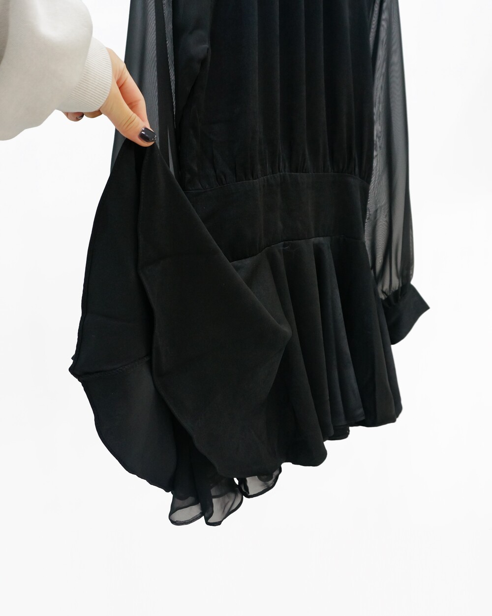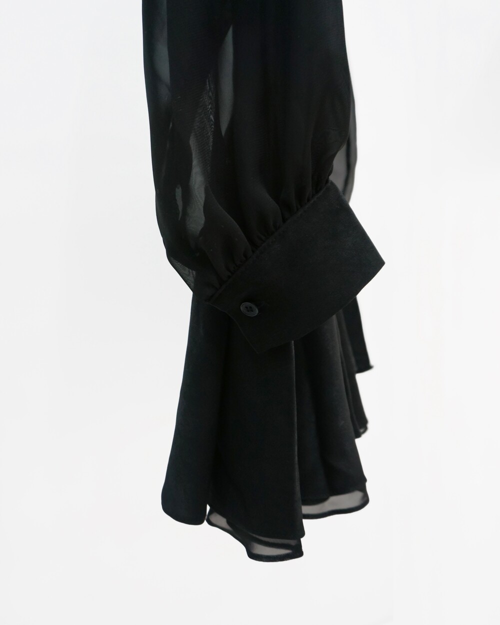- 새틴질감의 몸통, 쉬폰 소재의 소매.