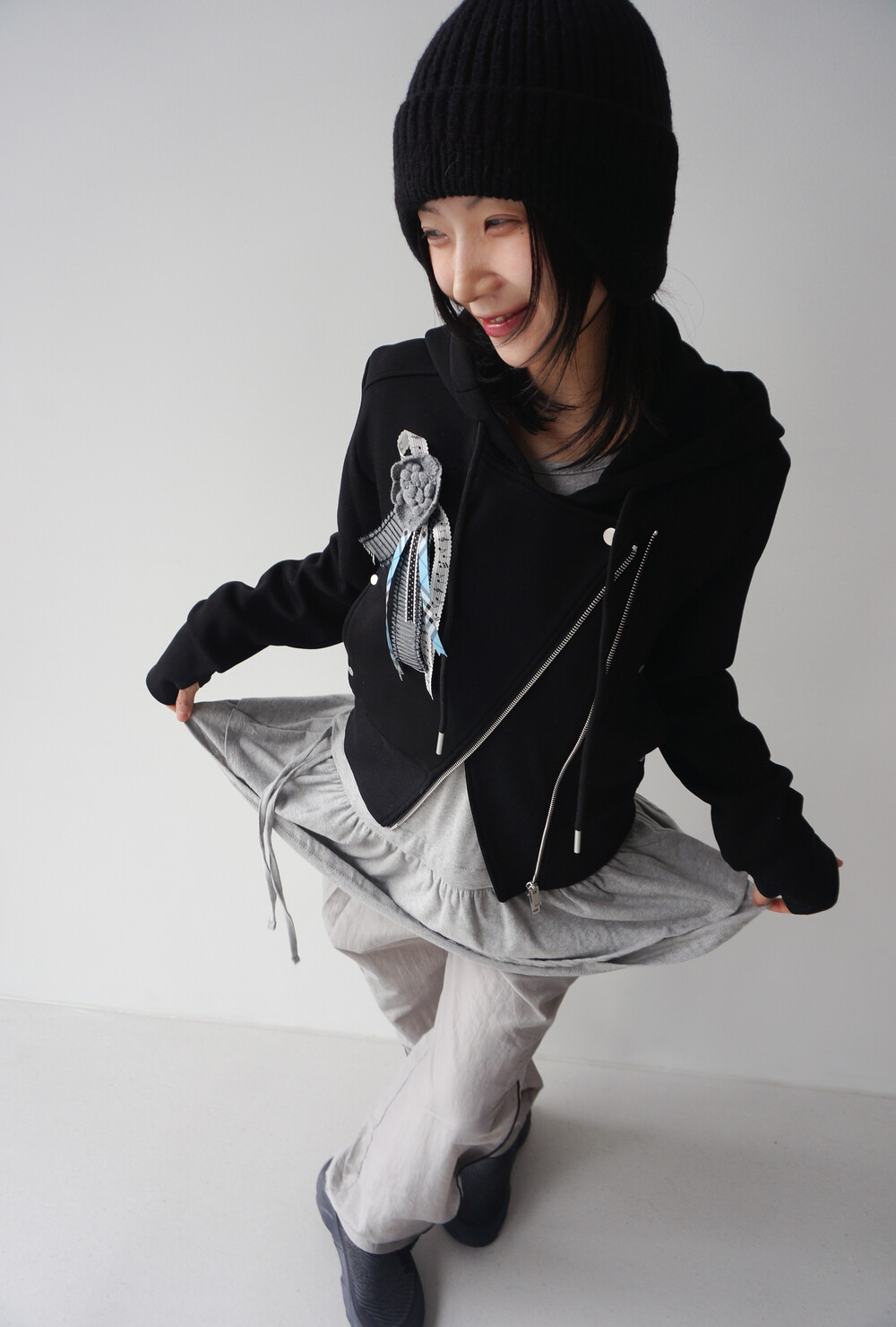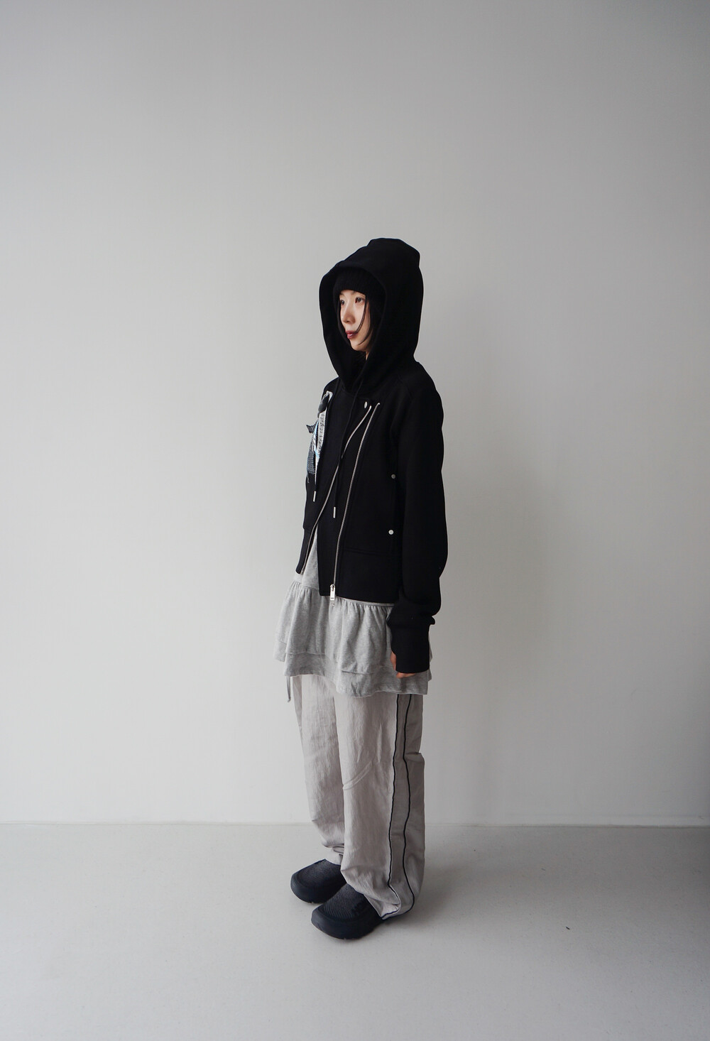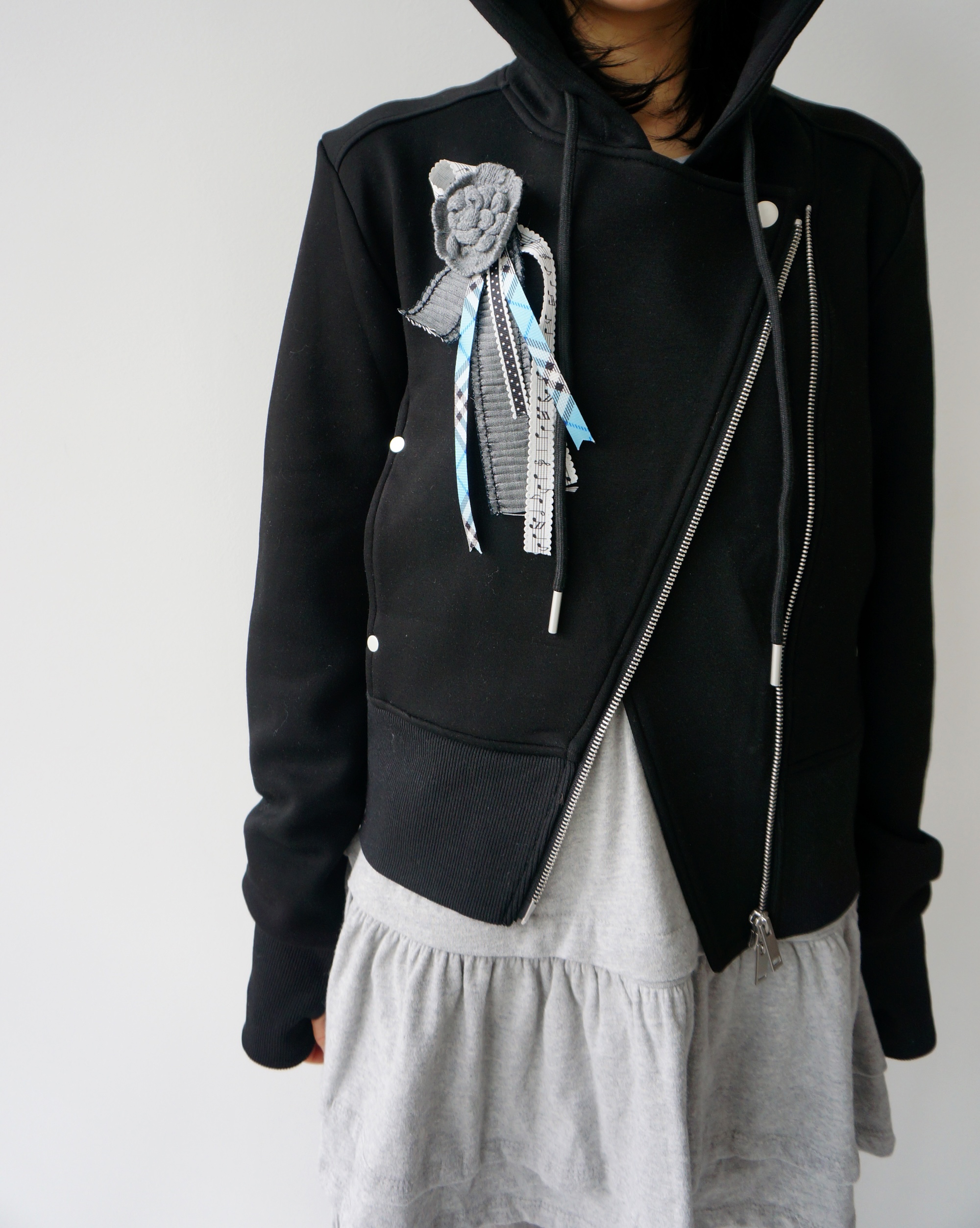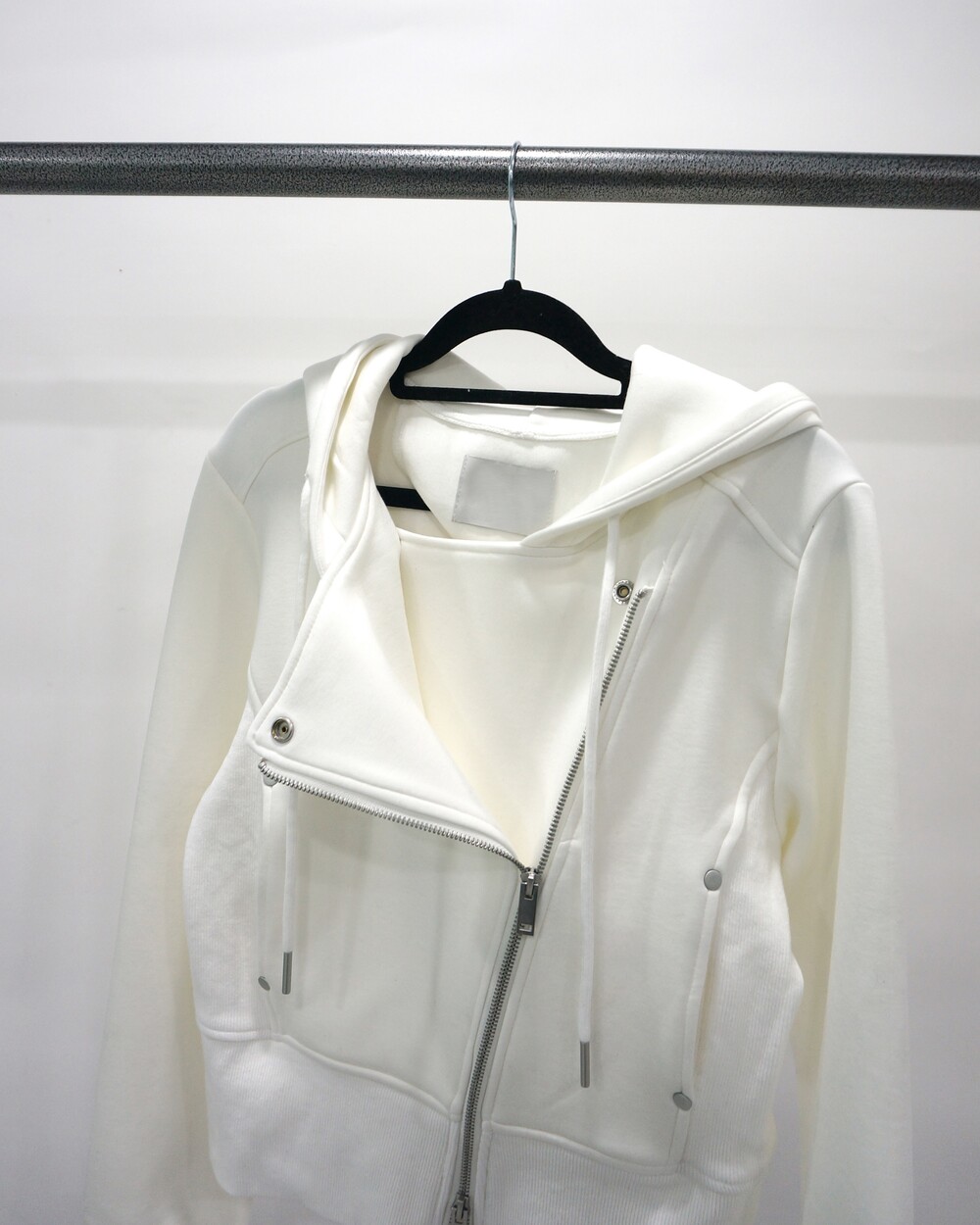 - 독특한 라이더자켓 디테일의 후드집업.