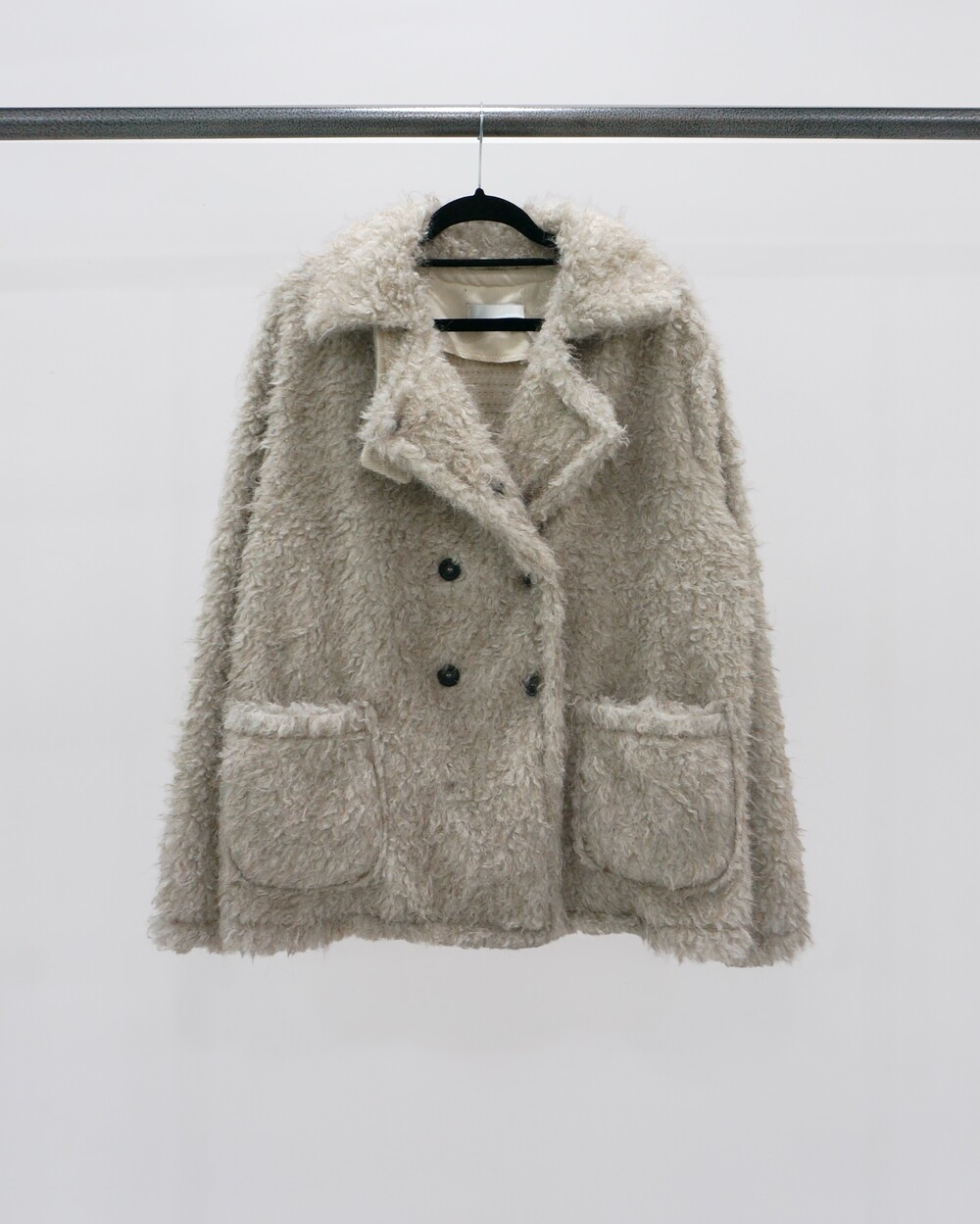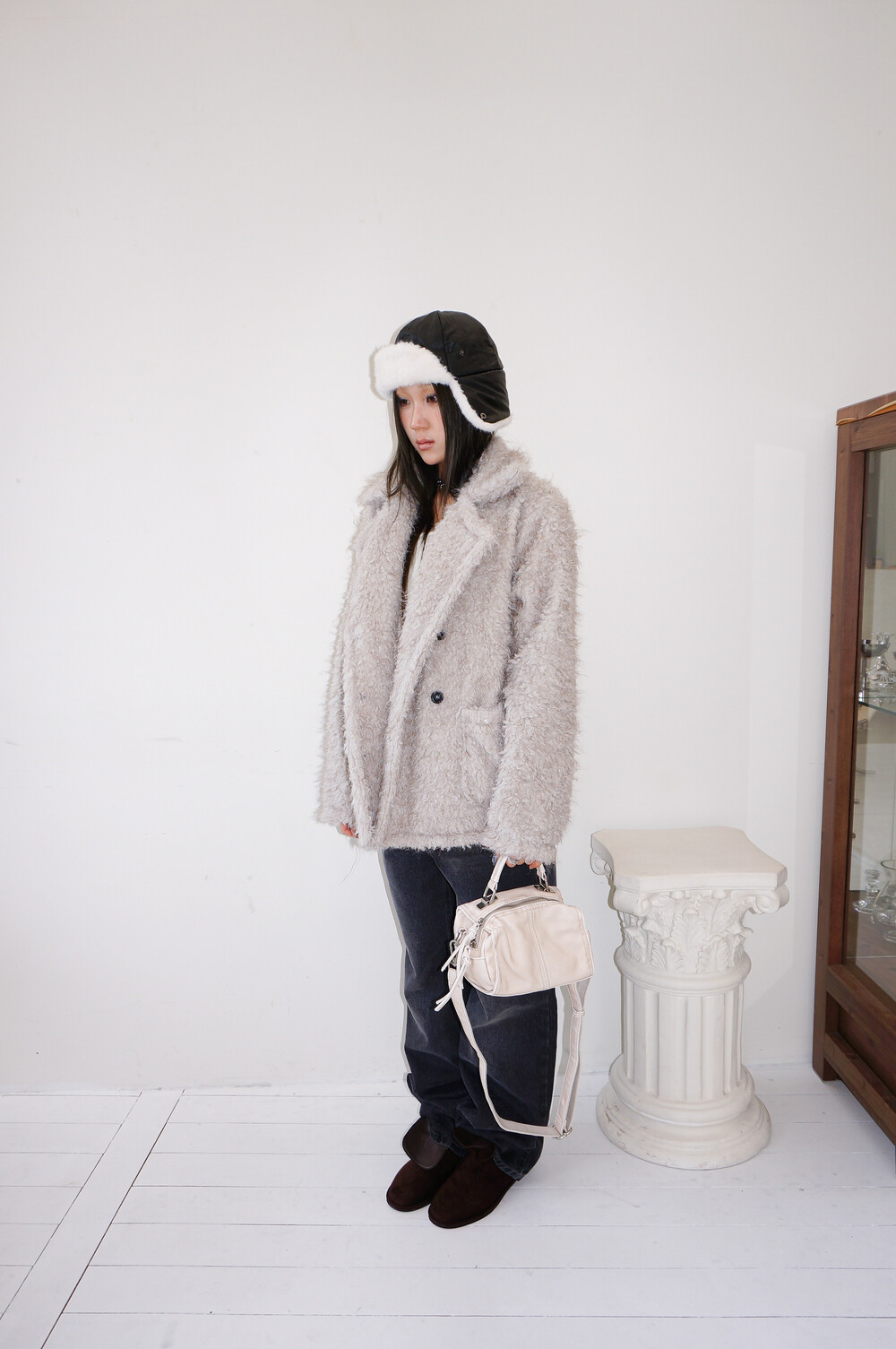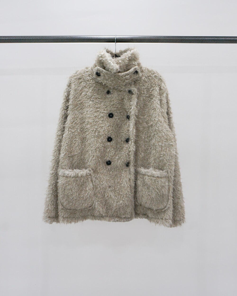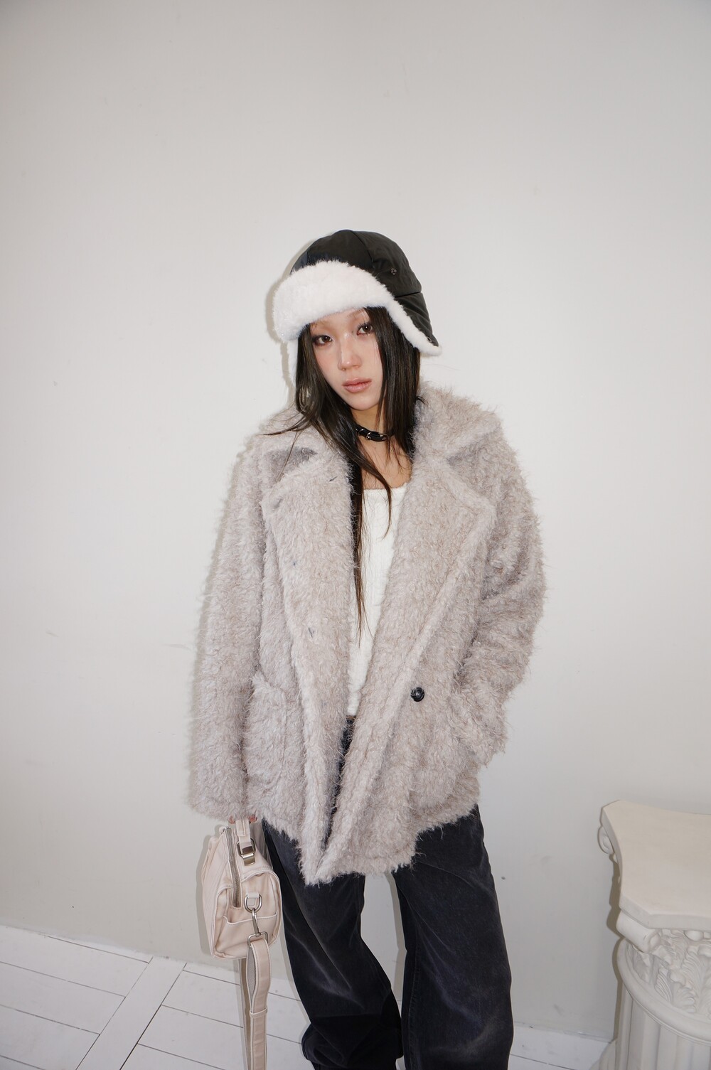 - 하이넥으로 연출가능한 퍼 더블코트.
