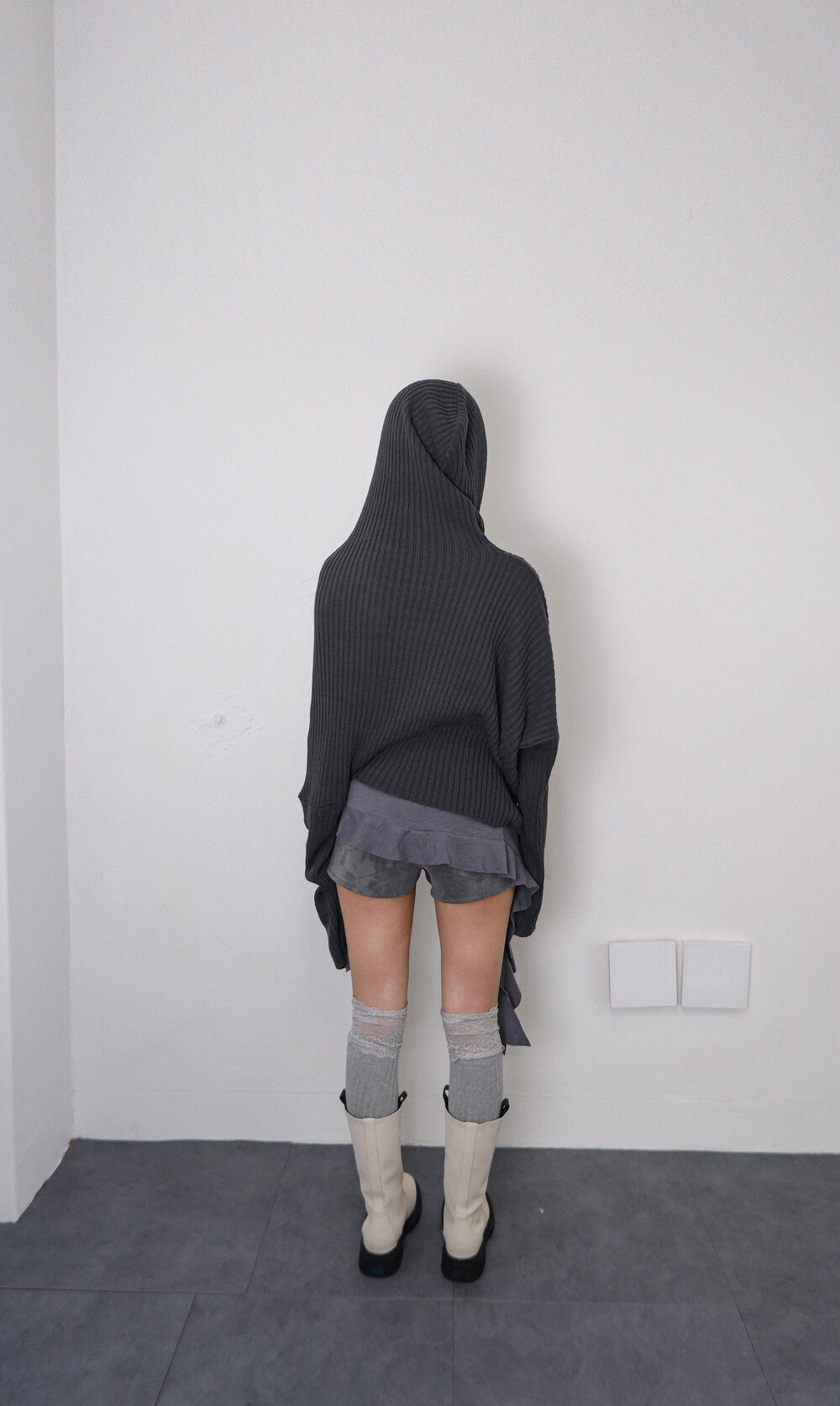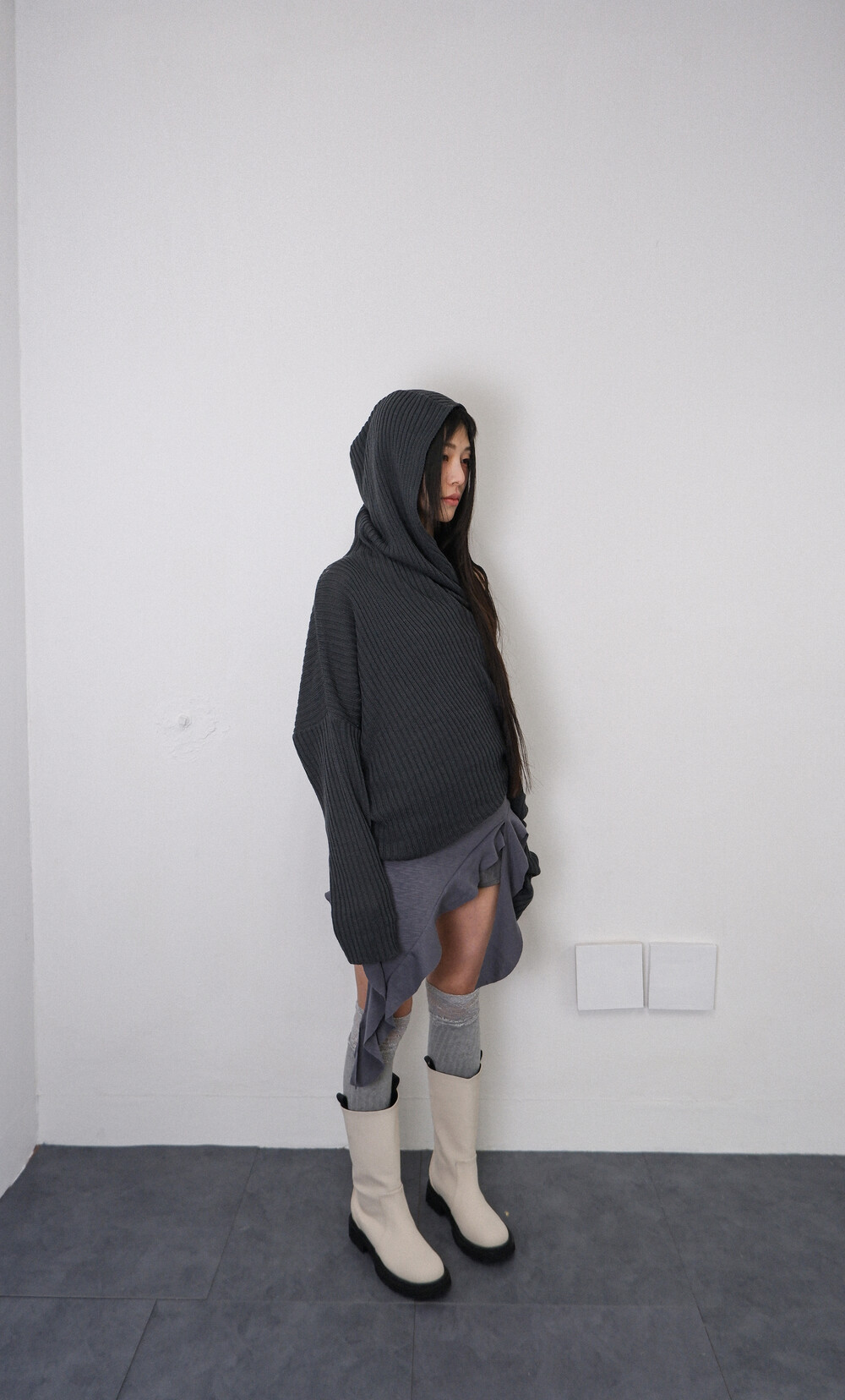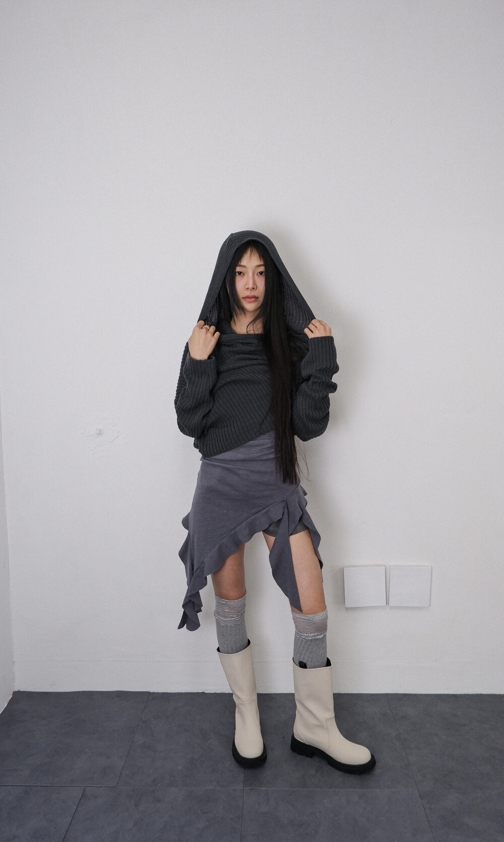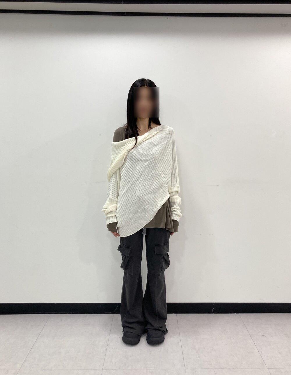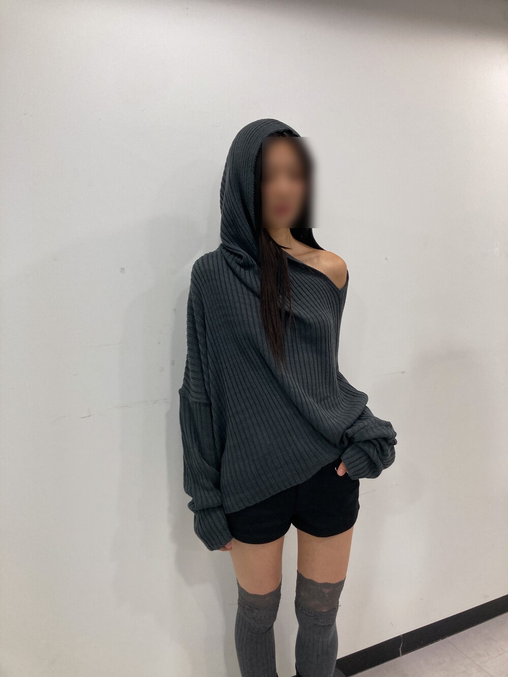 * 사선으로 떨어지는 밑단과 넓은 넥라인, 옆면으로 위치한 넓은 후드로 오프숄더로도 착용가능합니다.