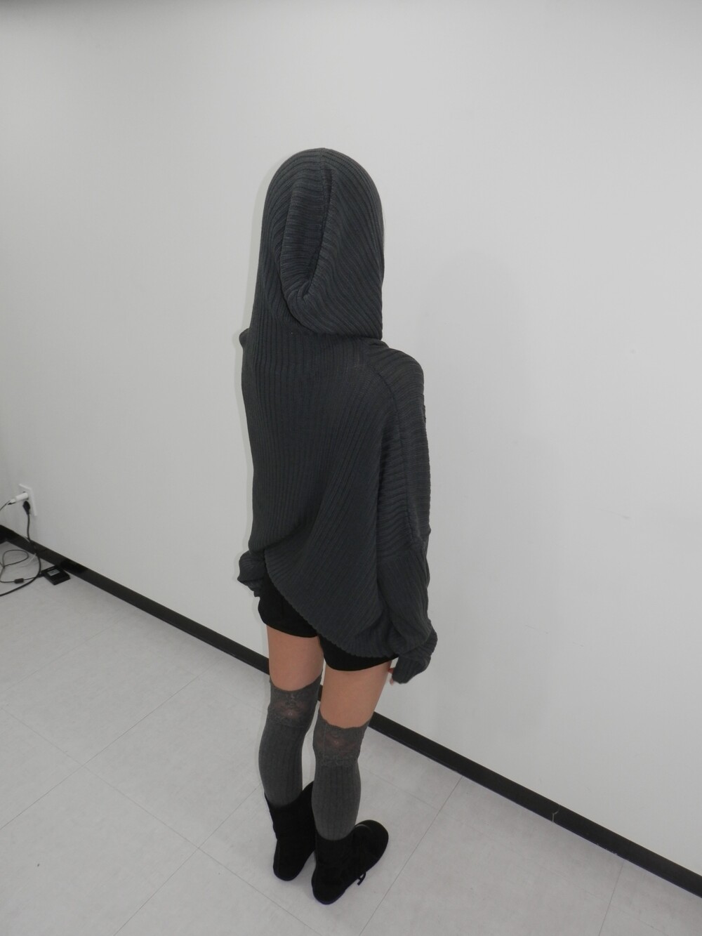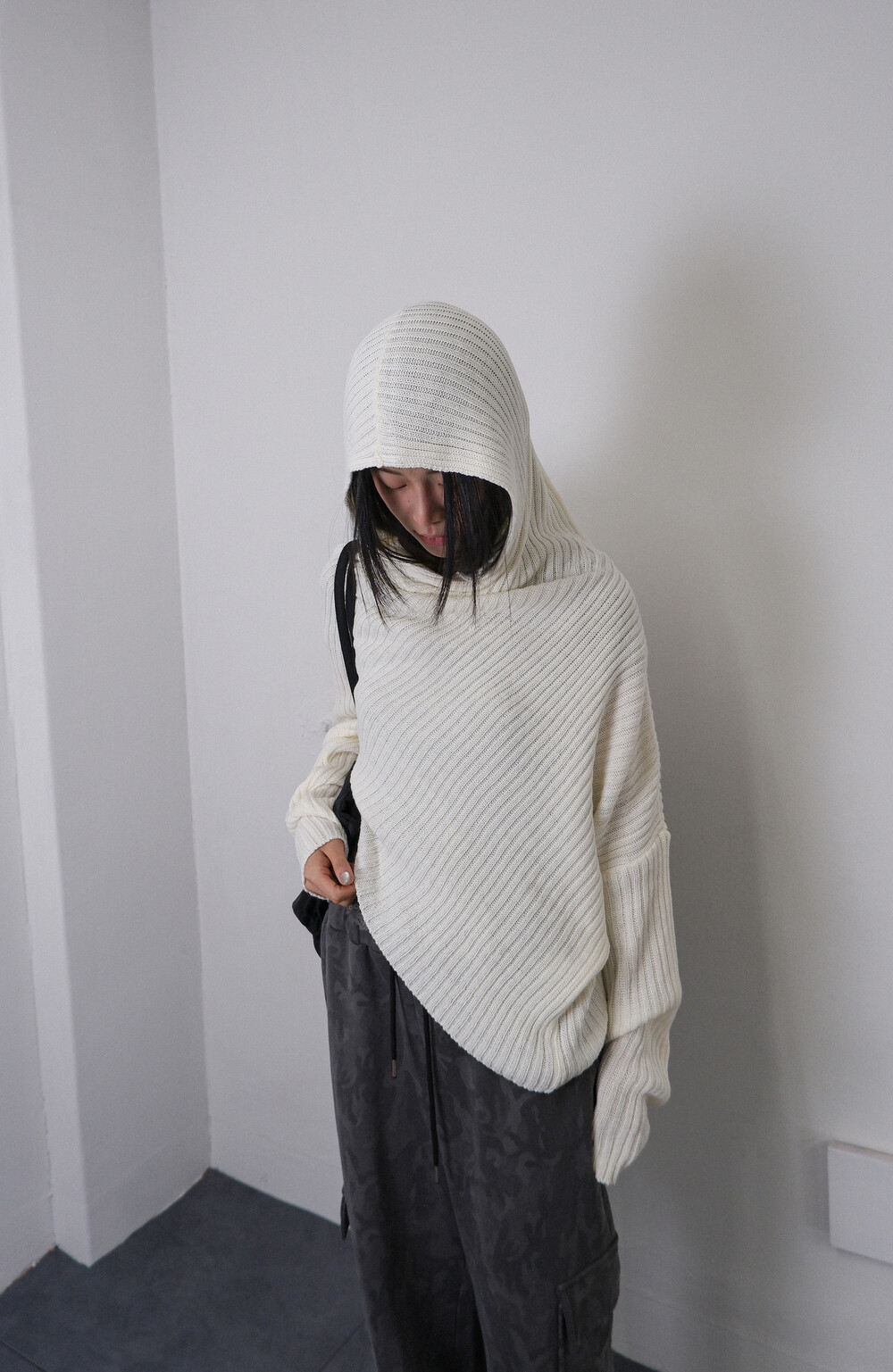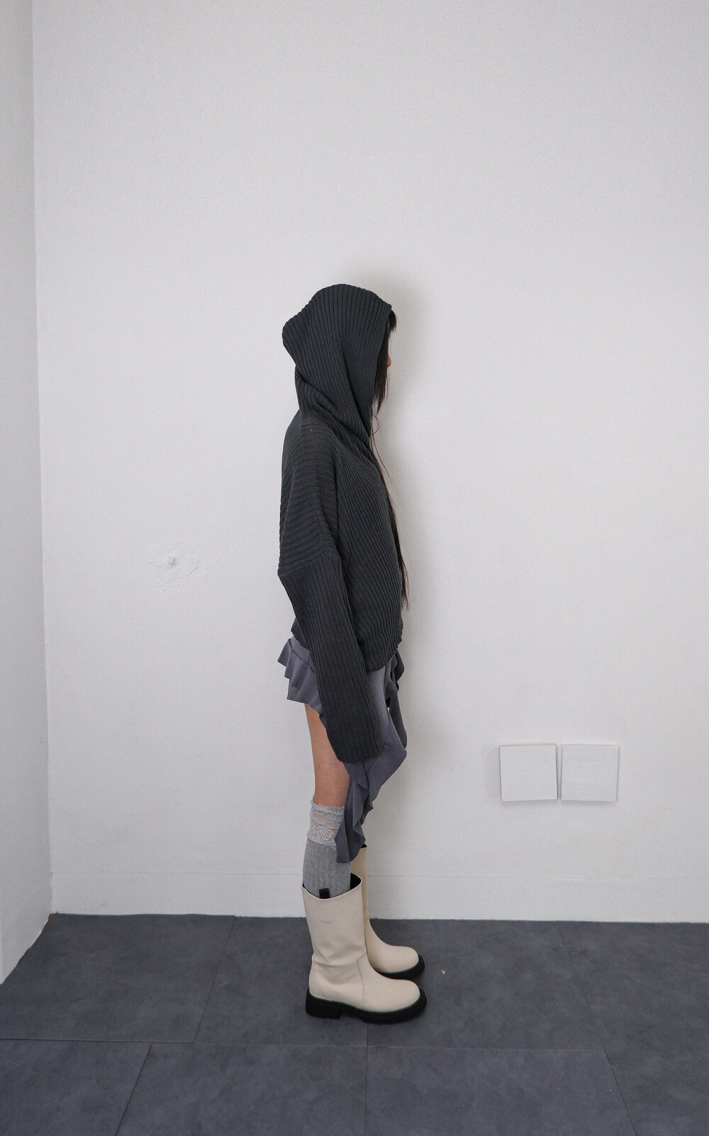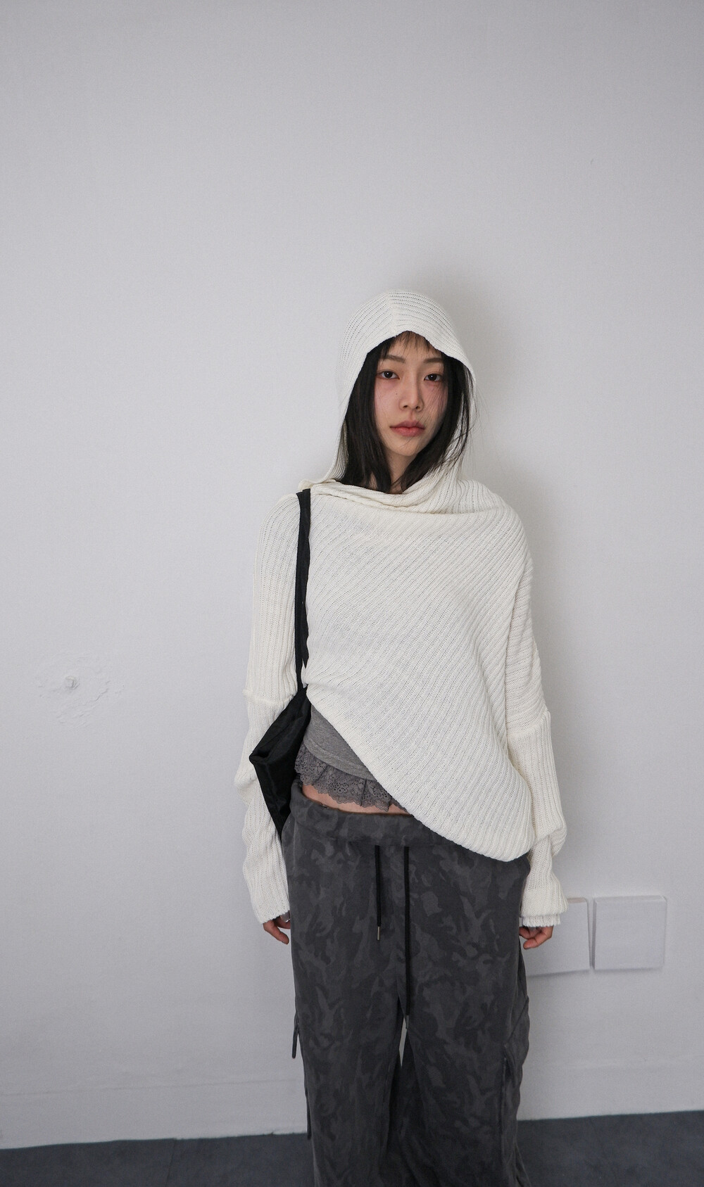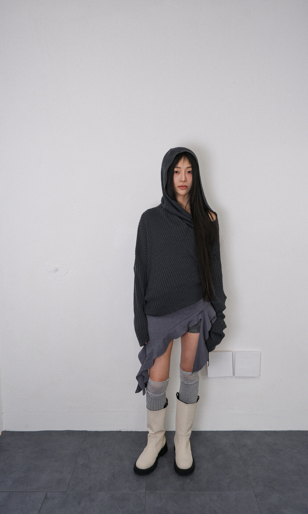 * 사선으로 떨어지는 밑단과 넓은 넥라인, 옆면으로 위치한 넓은 후드로 오프숄더로도 착용가능합니다.