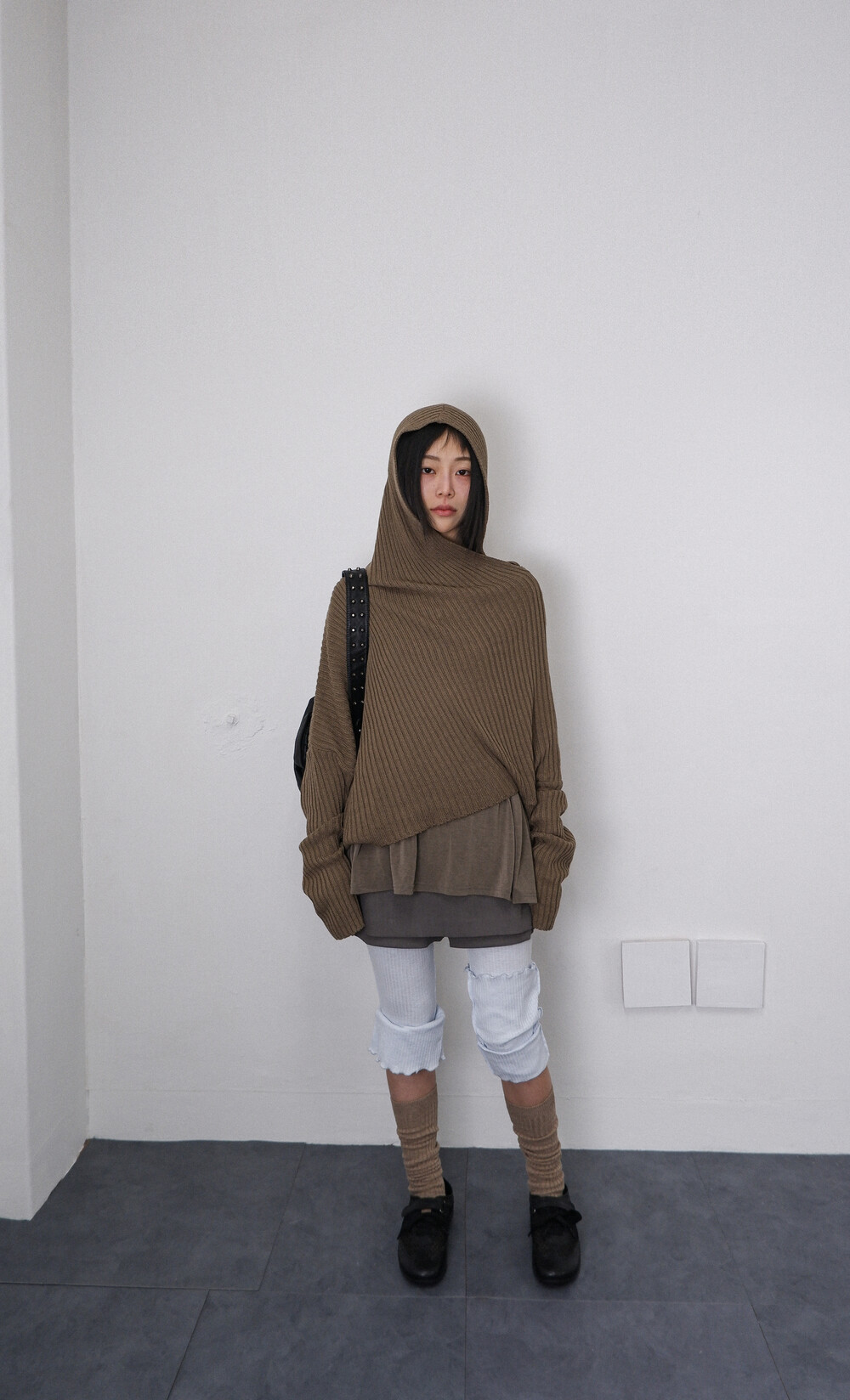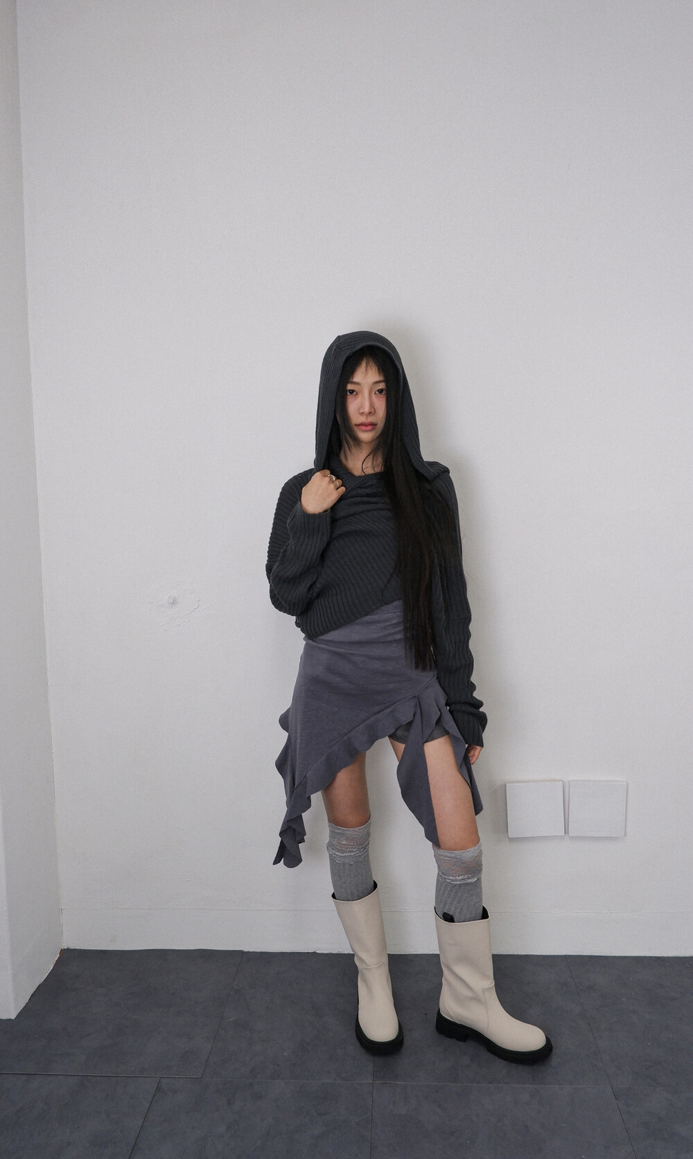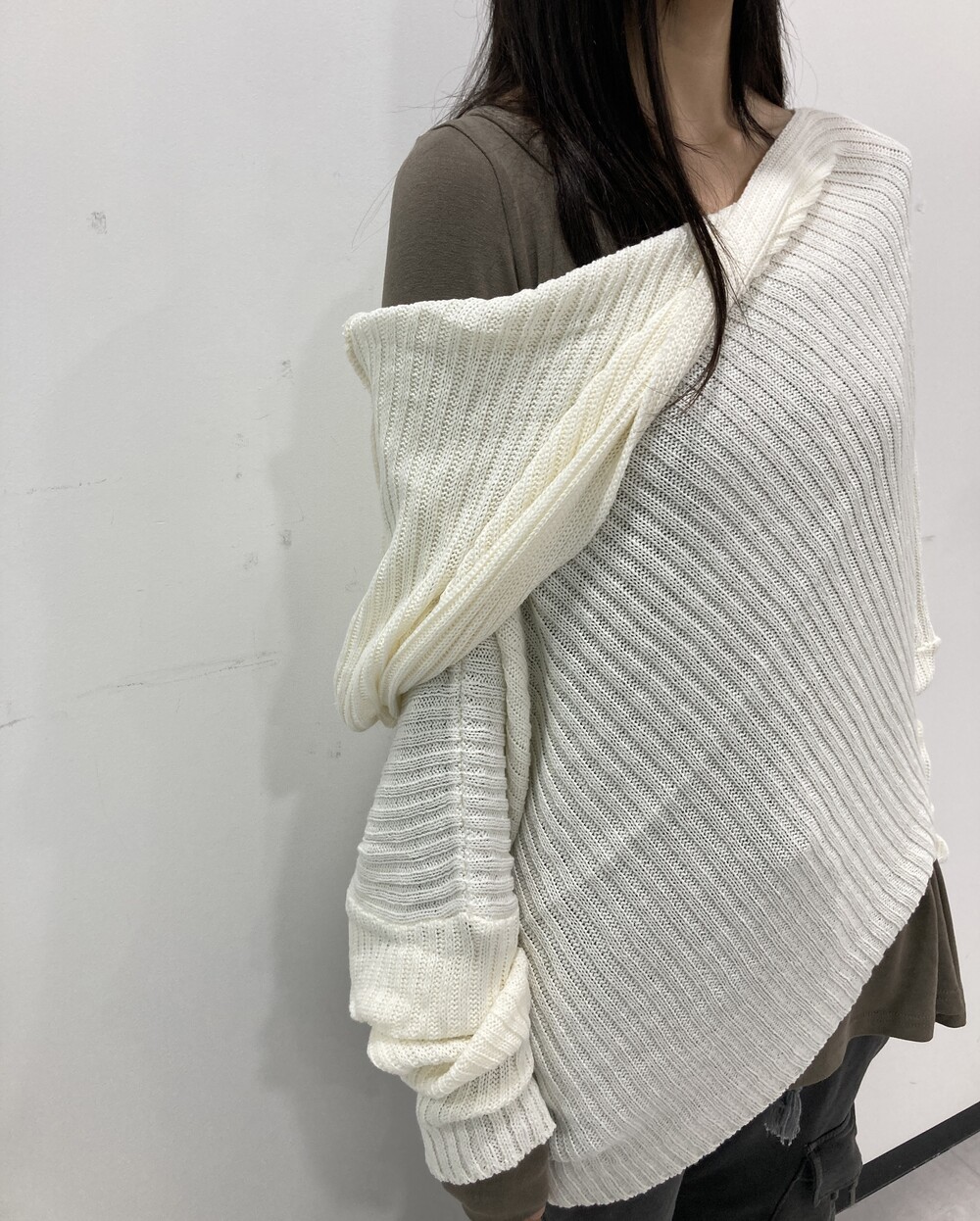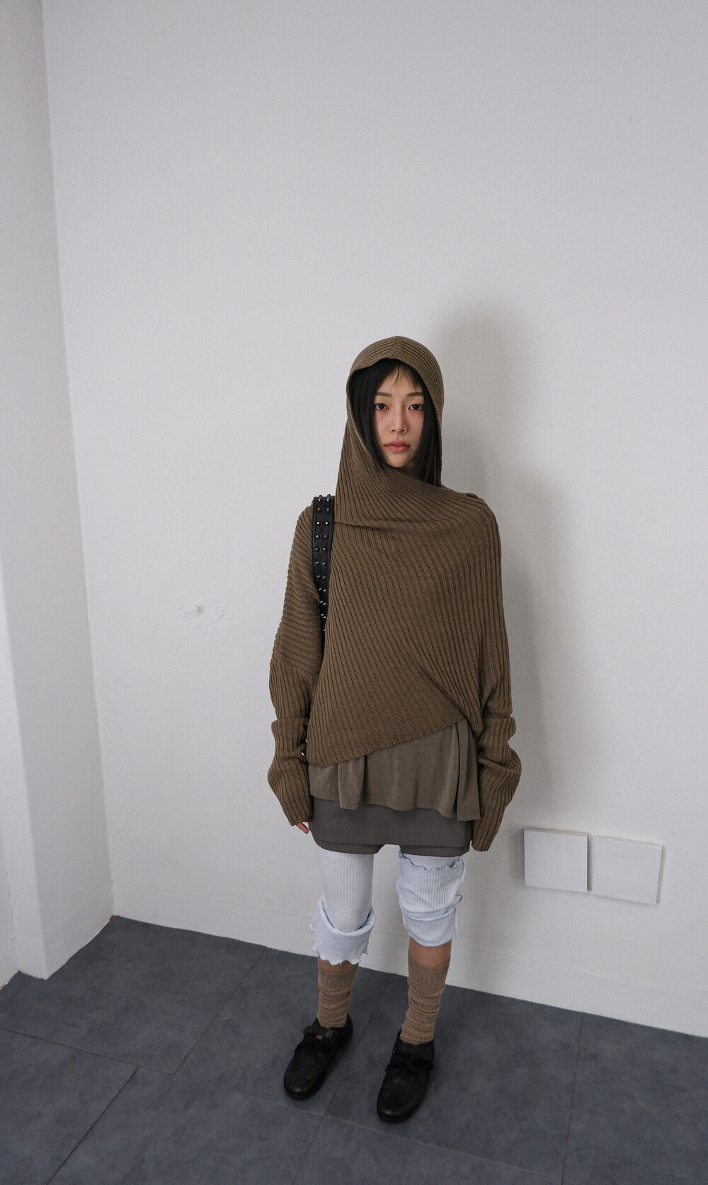 * 사선으로 떨어지는 밑단과 넓은 넥라인, 옆면으로 위치한 넓은 후드로 오프숄더로도 착용가능합니다.