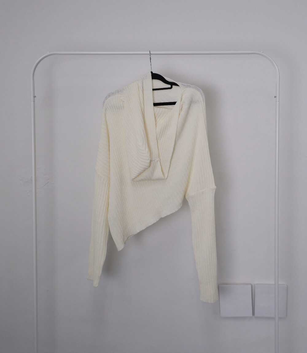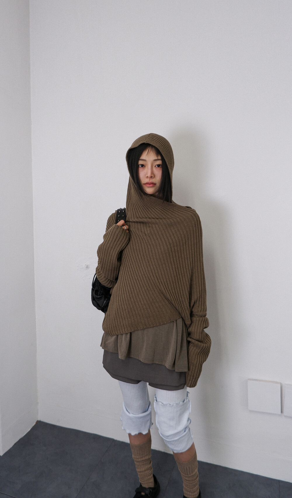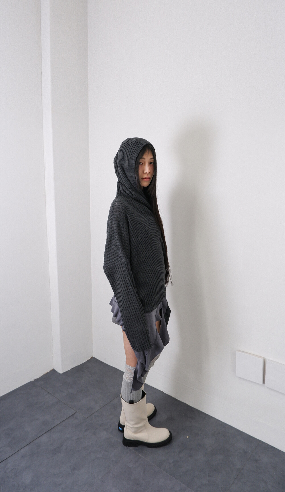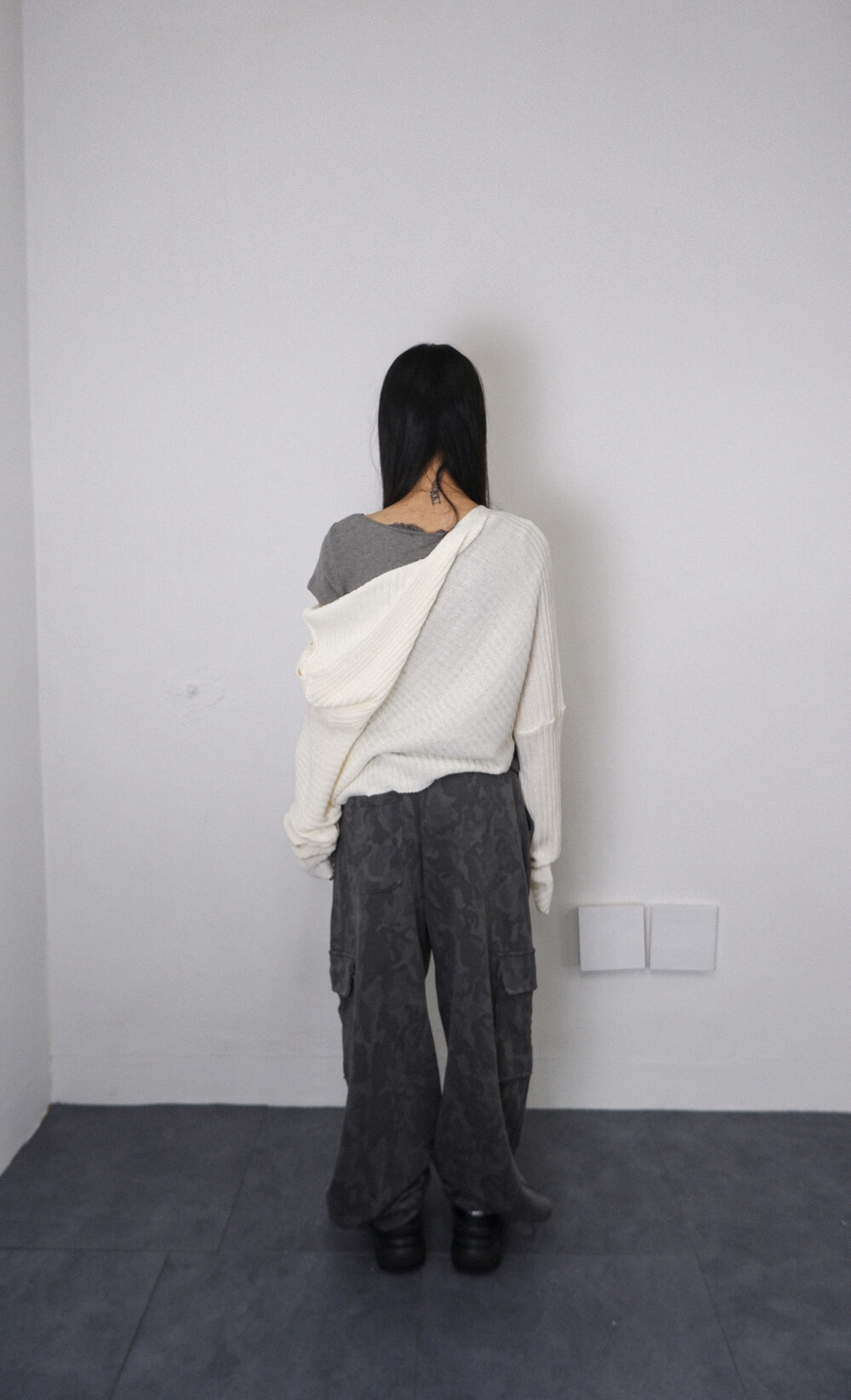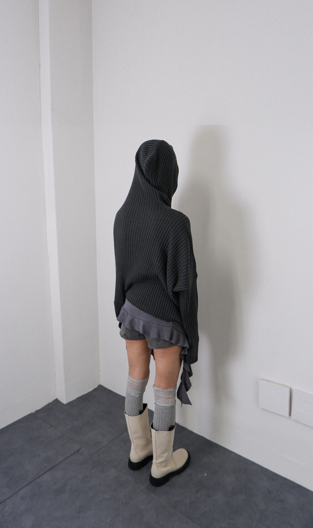 * 사선으로 떨어지는 밑단과 넓은 넥라인, 옆면으로 위치한 넓은 후드로 오프숄더로도 착용가능합니다.