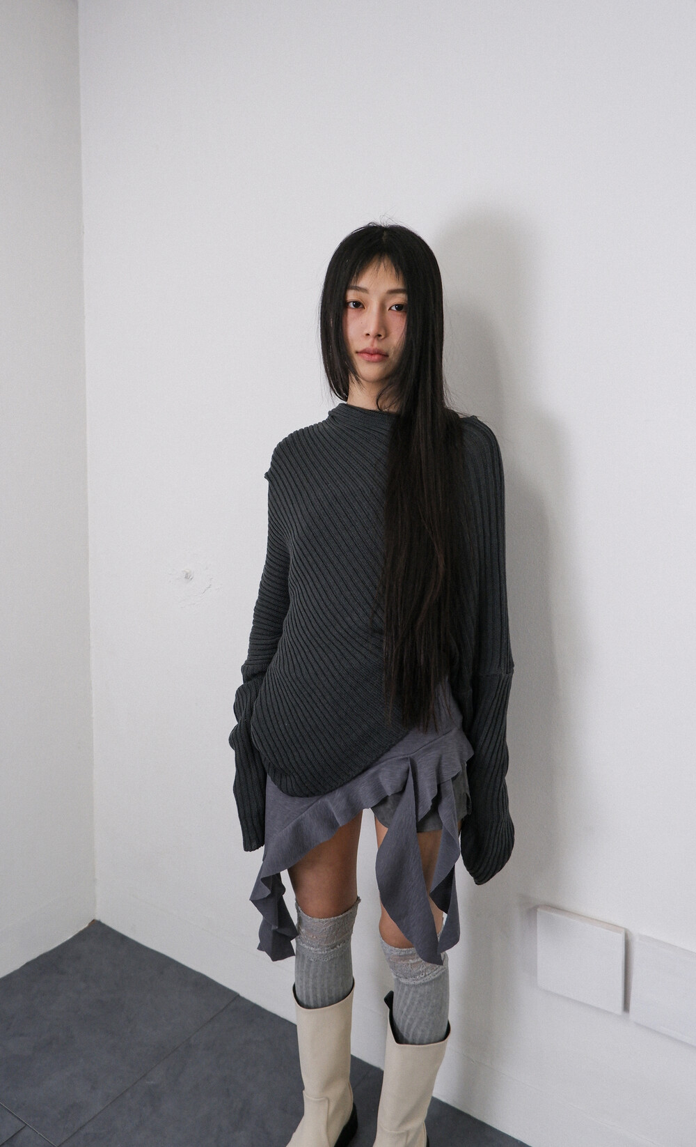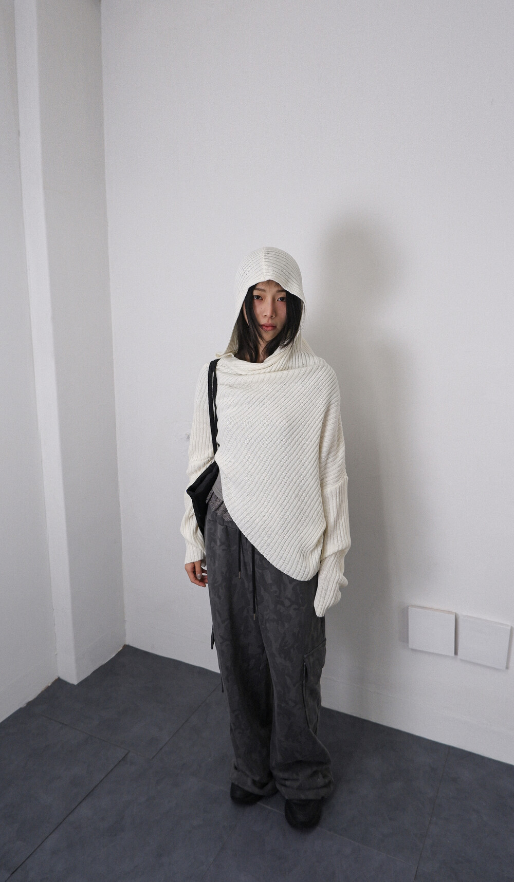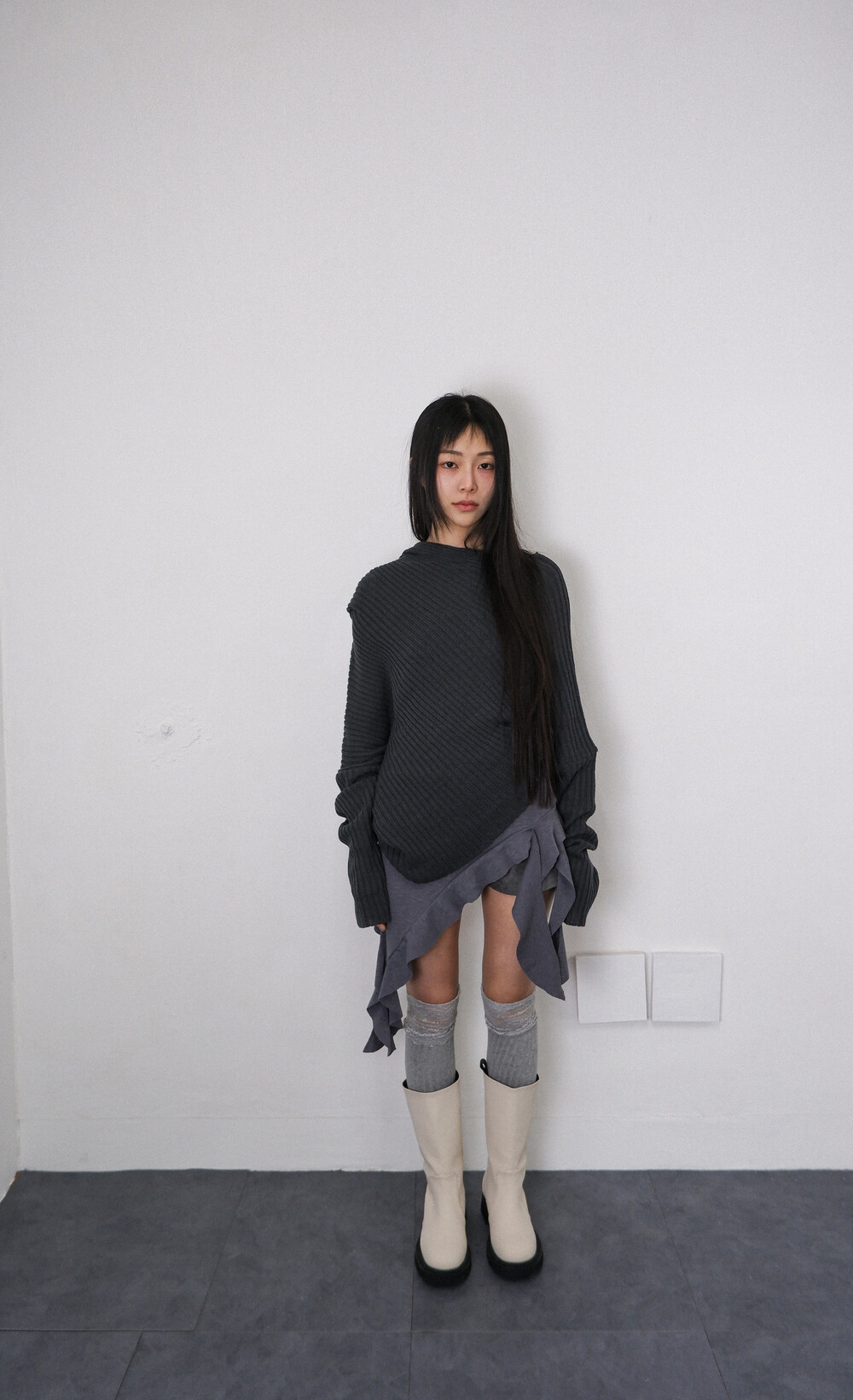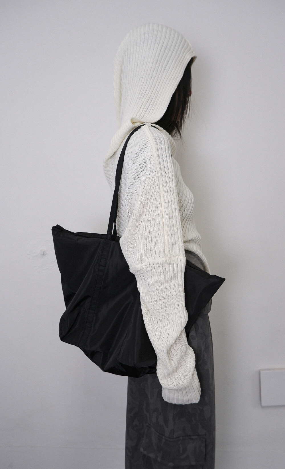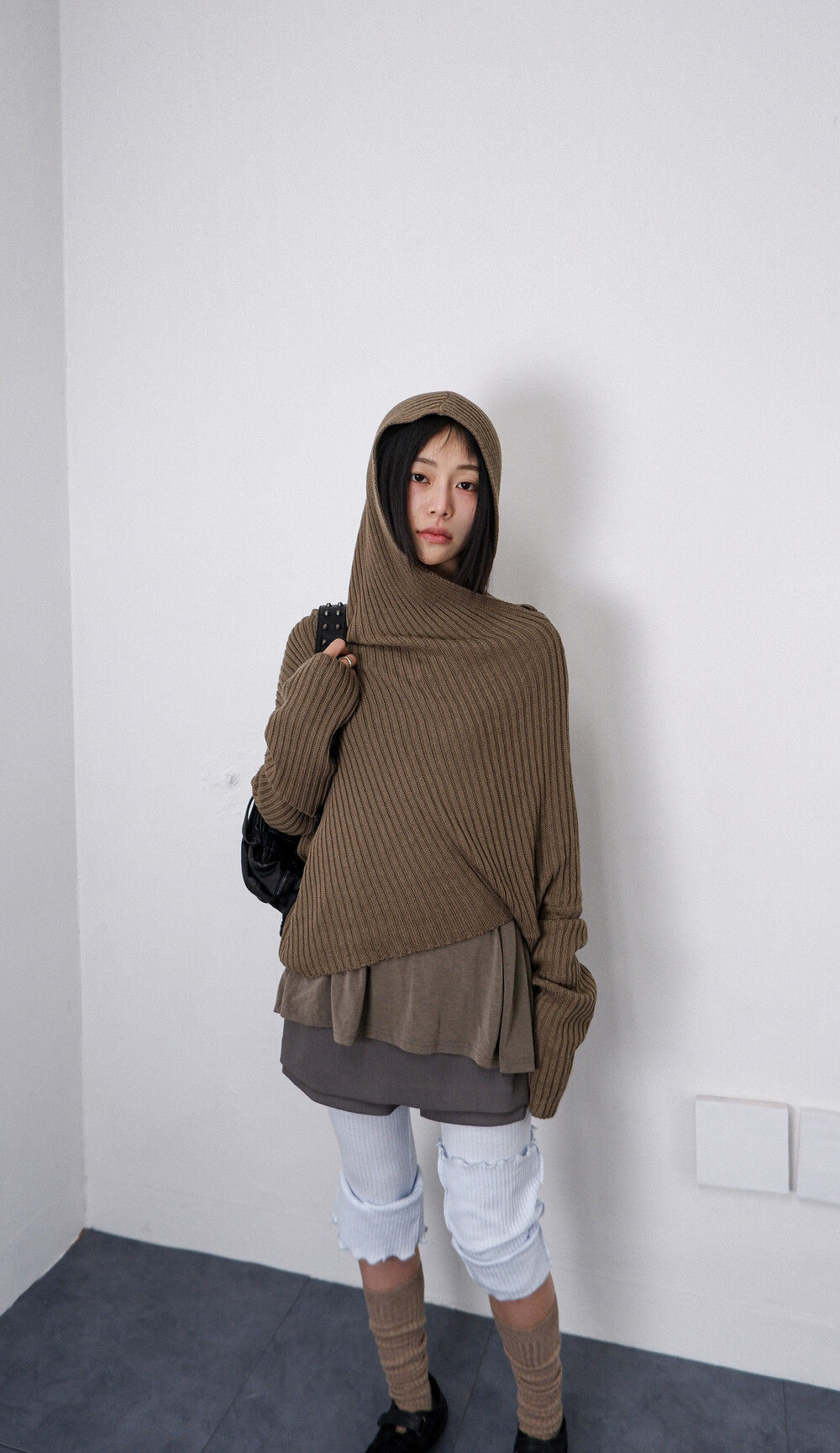 * 사선으로 떨어지는 밑단과 넓은 넥라인, 옆면으로 위치한 넓은 후드로 오프숄더로도 착용가능합니다.