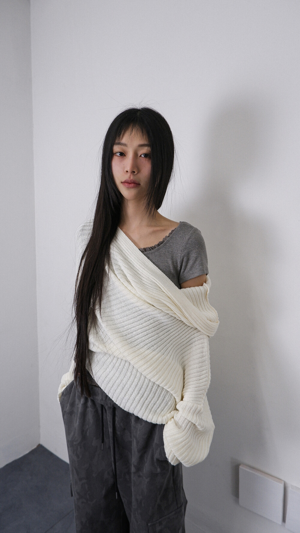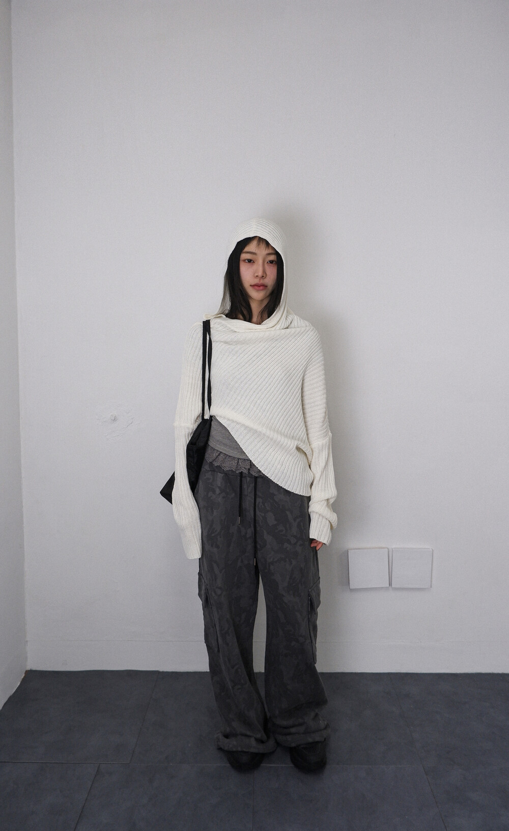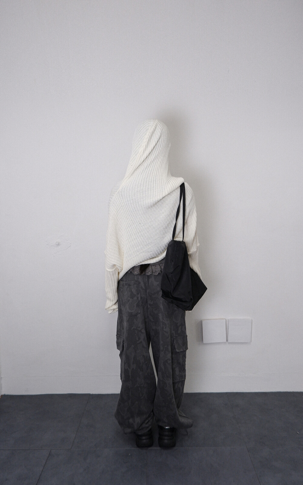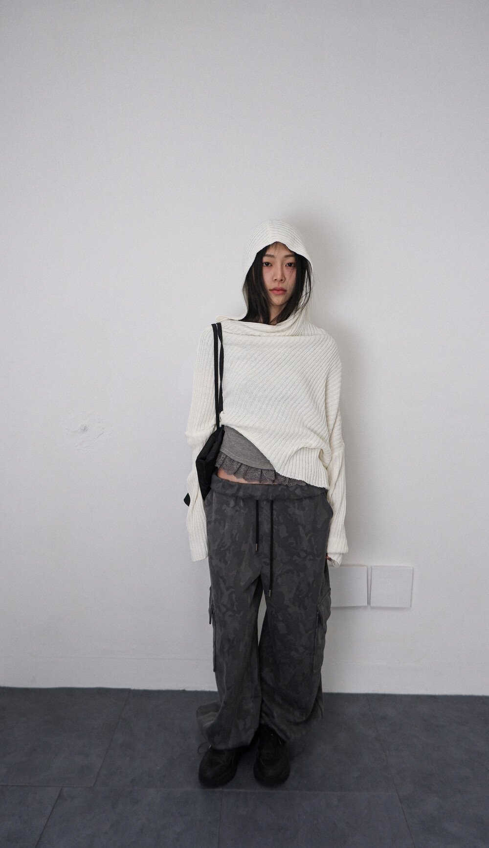* 사선으로 떨어지는 밑단과 넓은 넥라인, 옆면으로 위치한 넓은 후드로 오프숄더로도 착용가능합니다.
