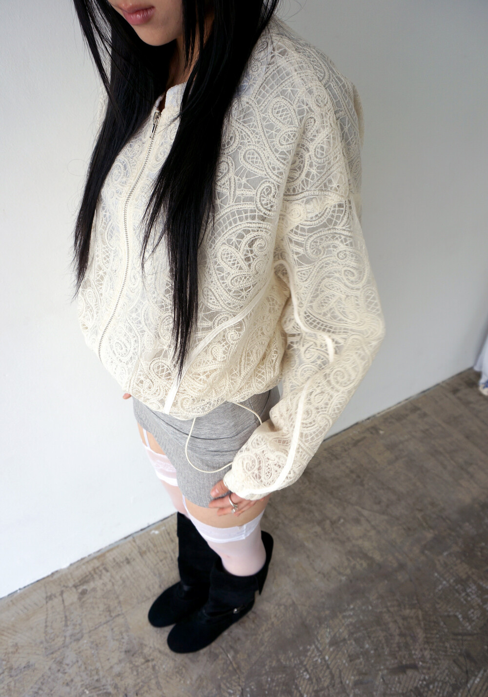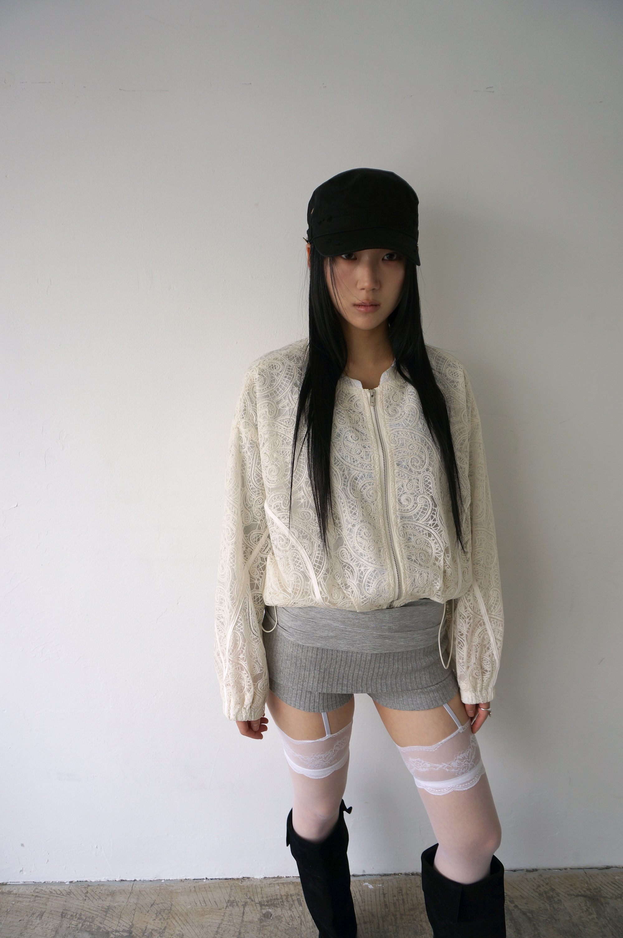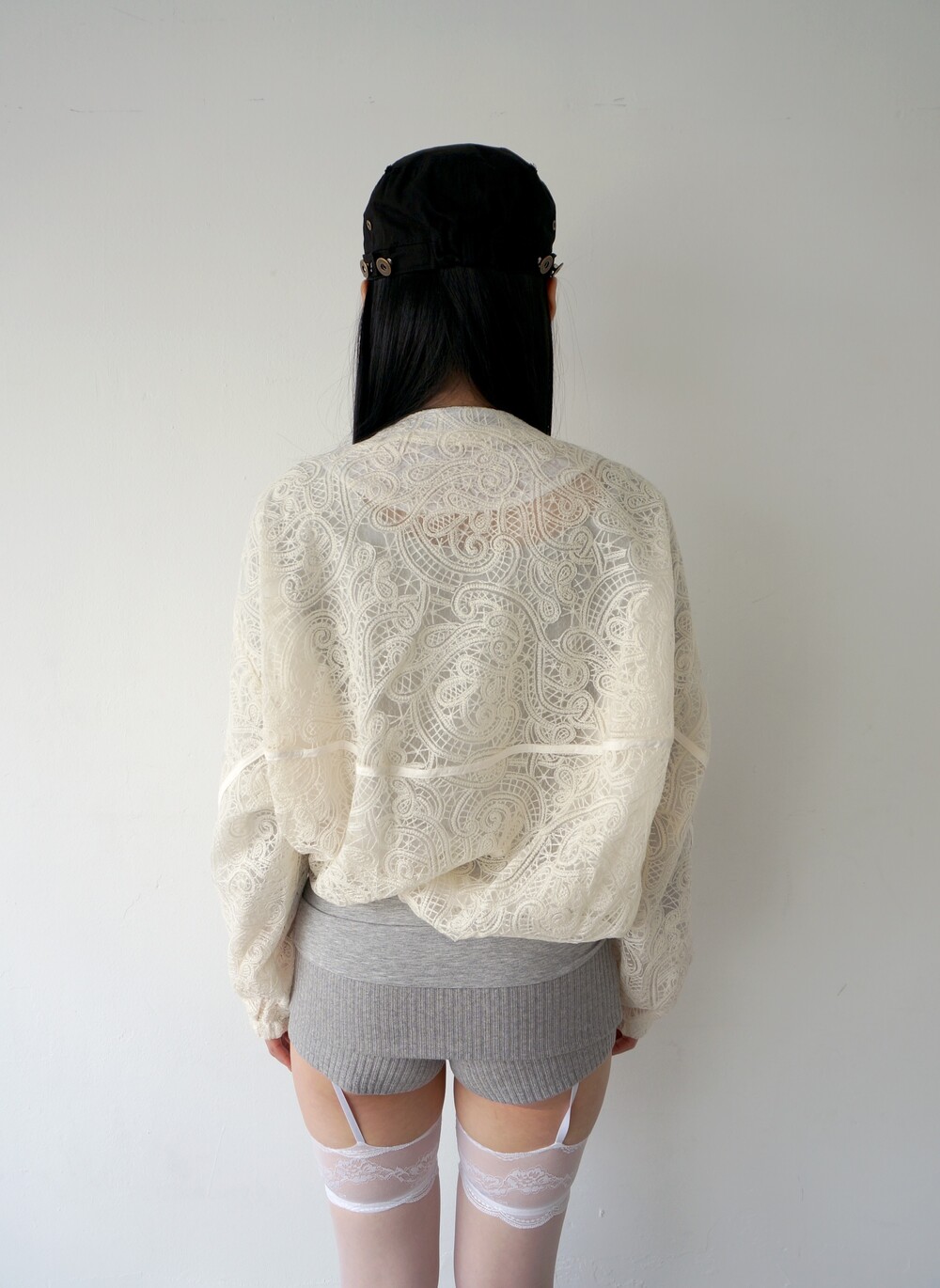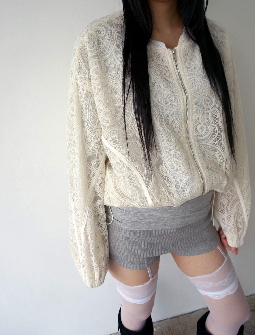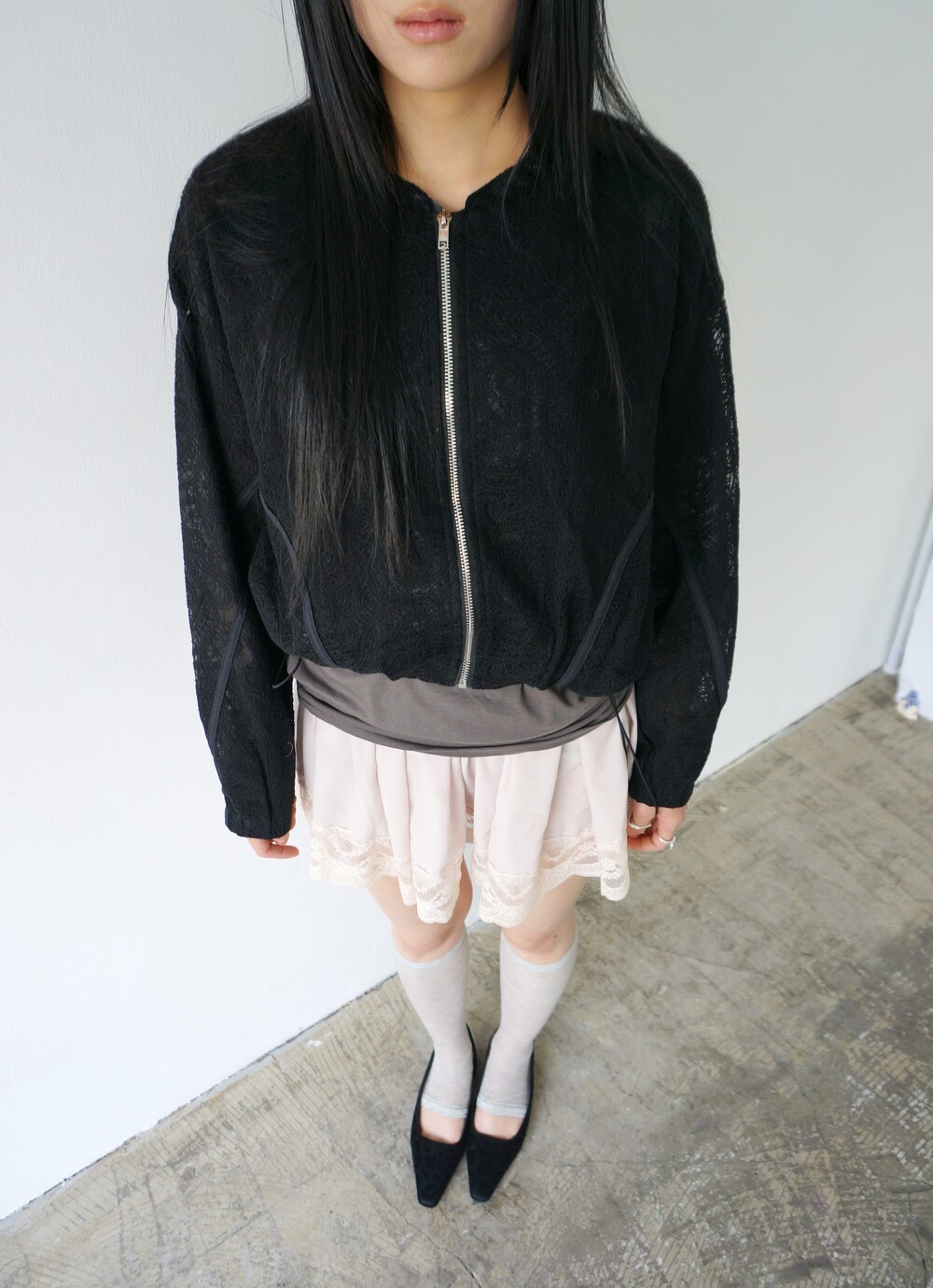 - 투명하게 비치는 레이스 디테일의 봄버자켓.