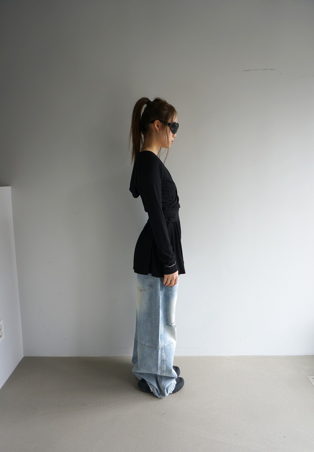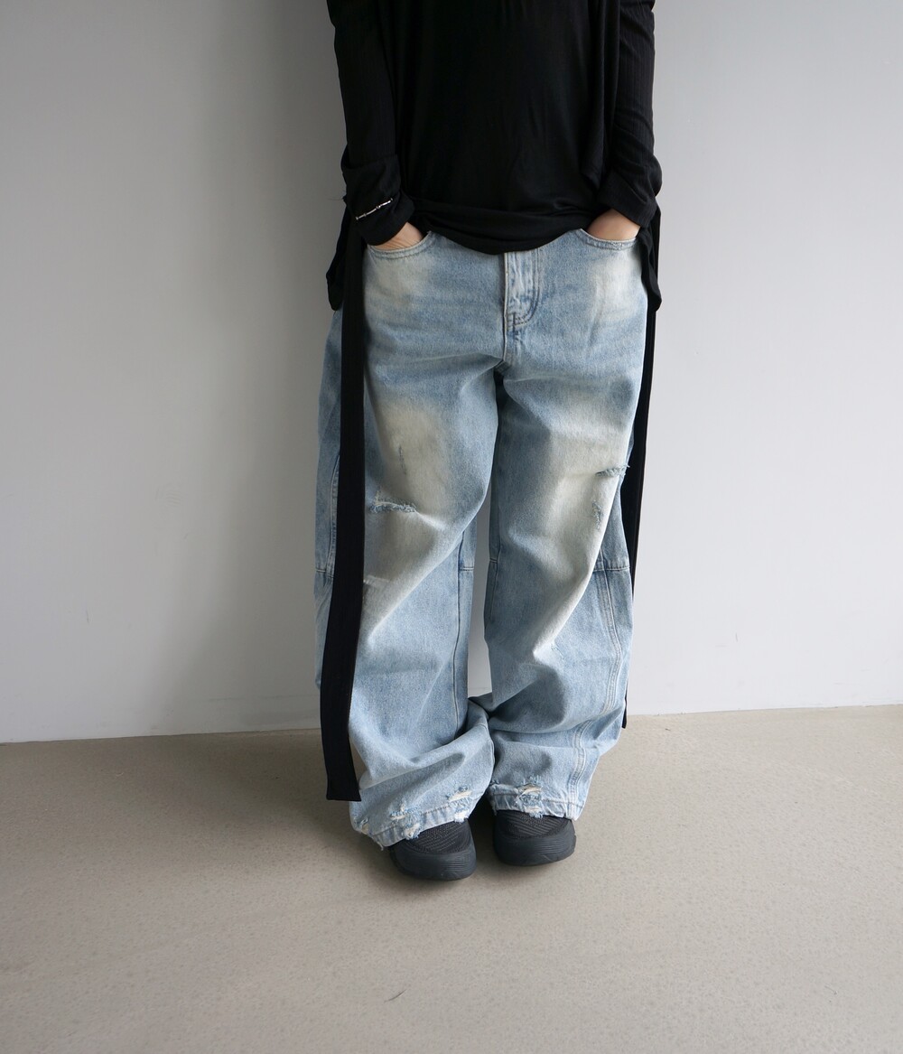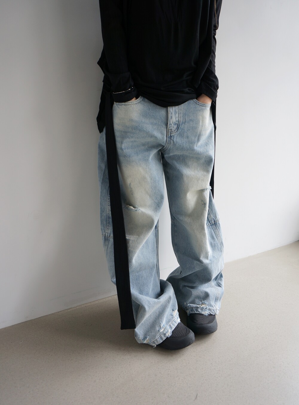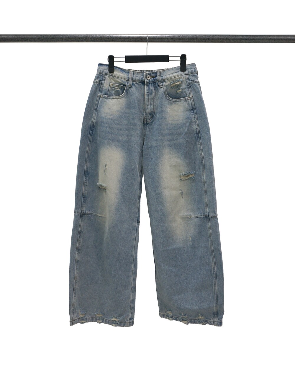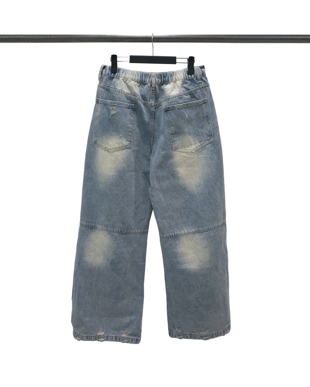 - 밝은 워싱과 데미지 디테일의 데님팬츠.