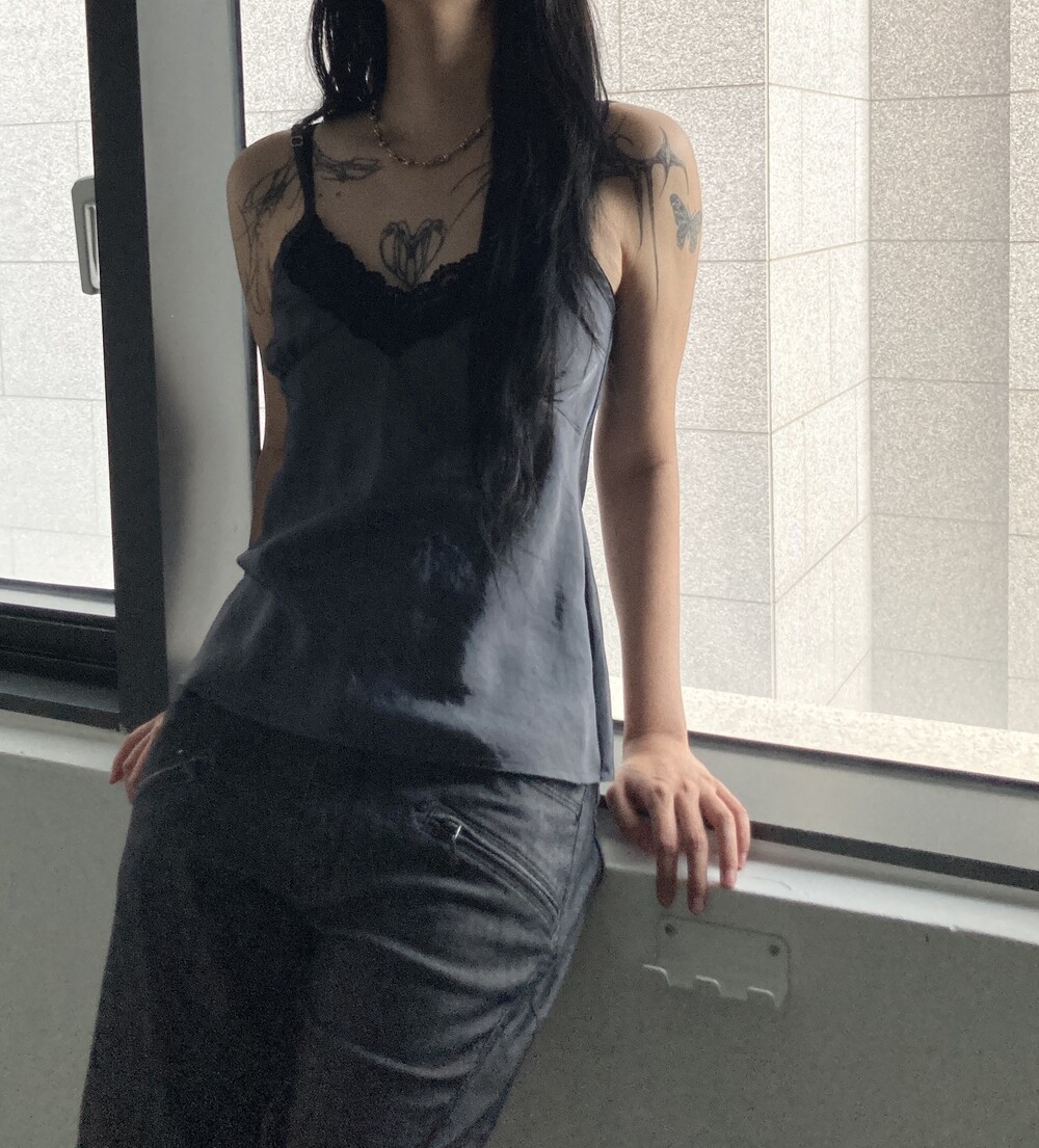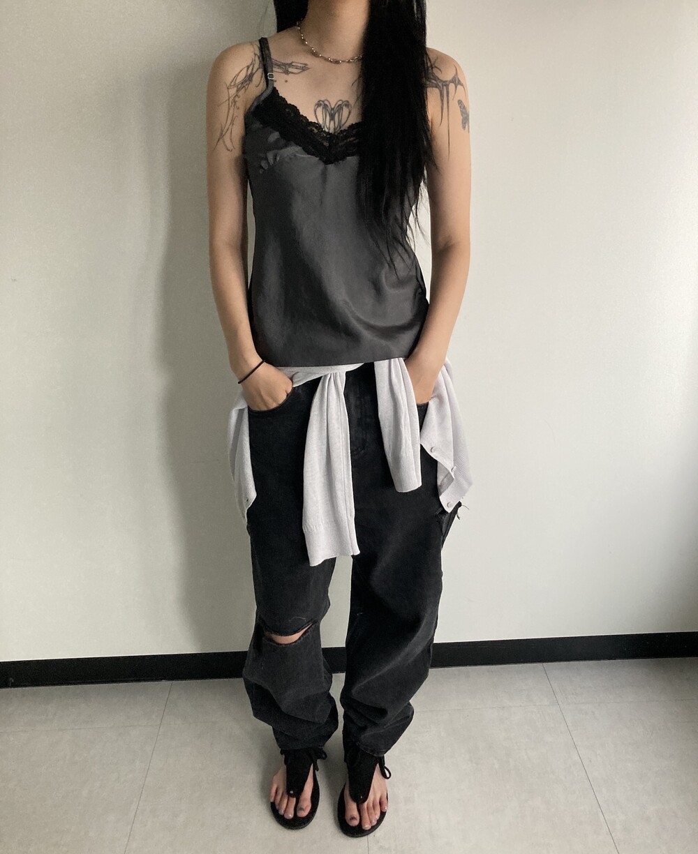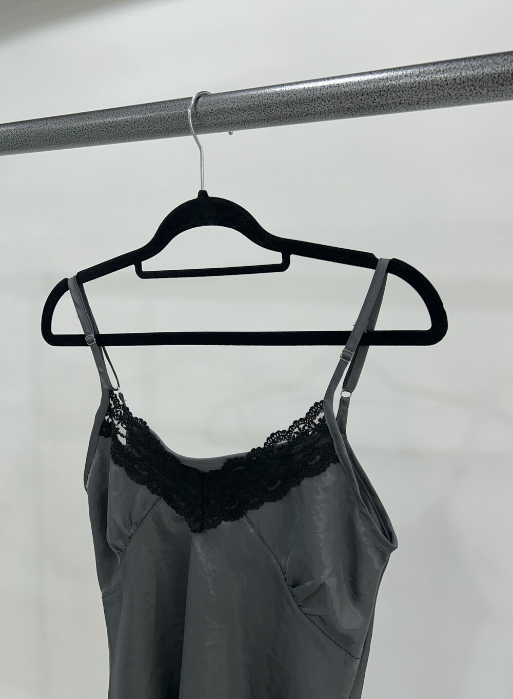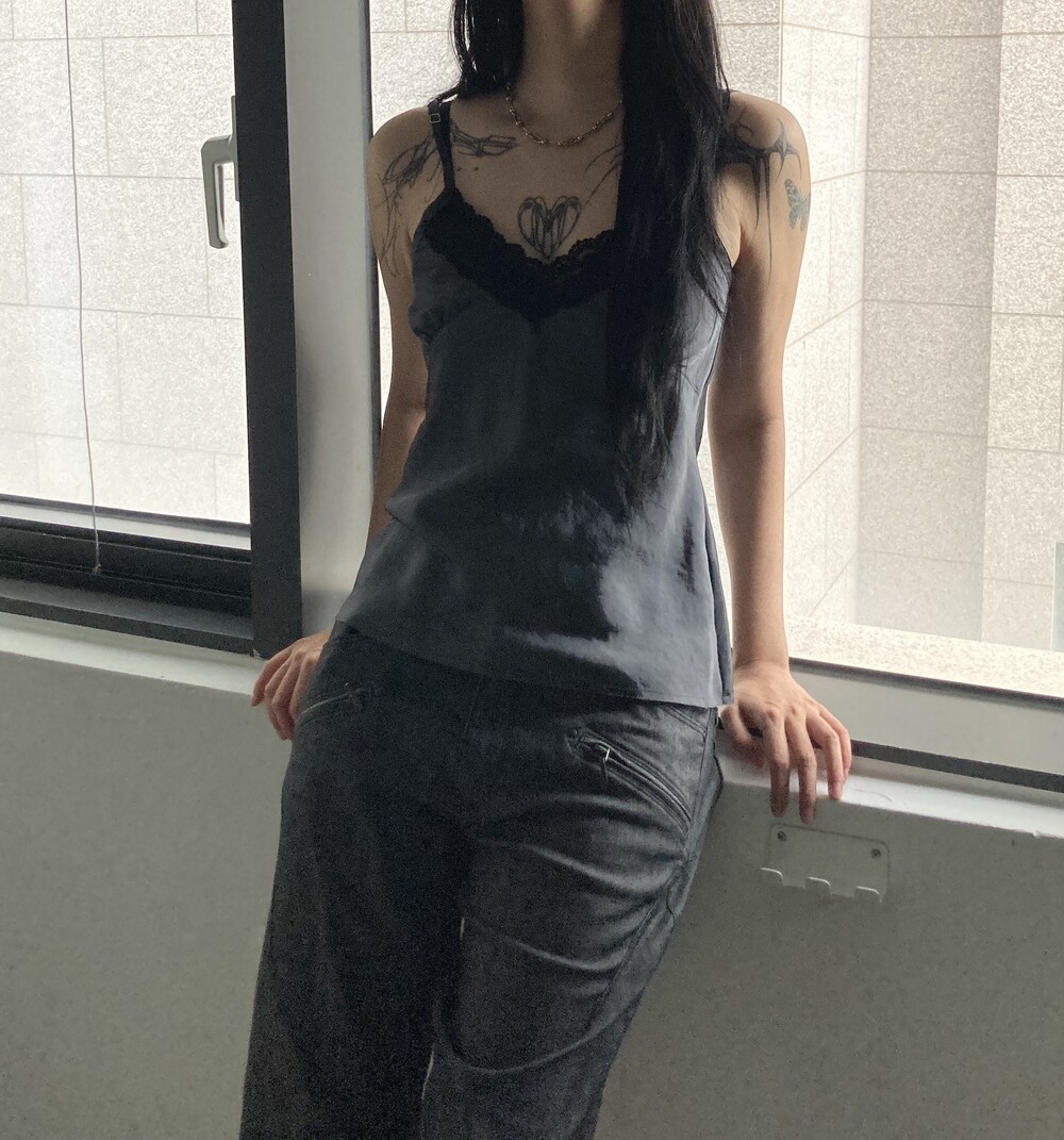 - 광택감있는 새틴소재와 상반되는 퍼석한 레이스 디테일.