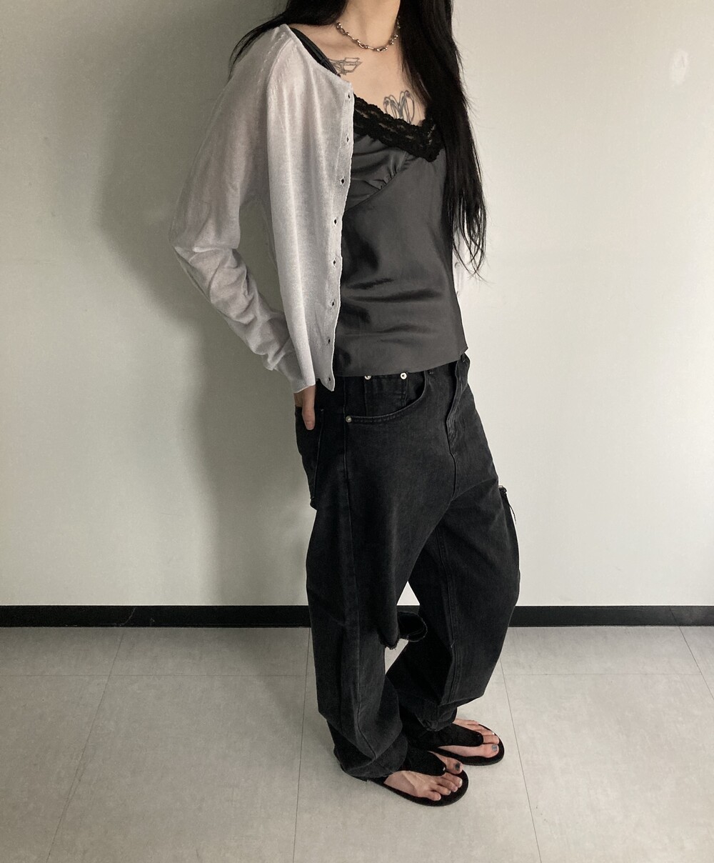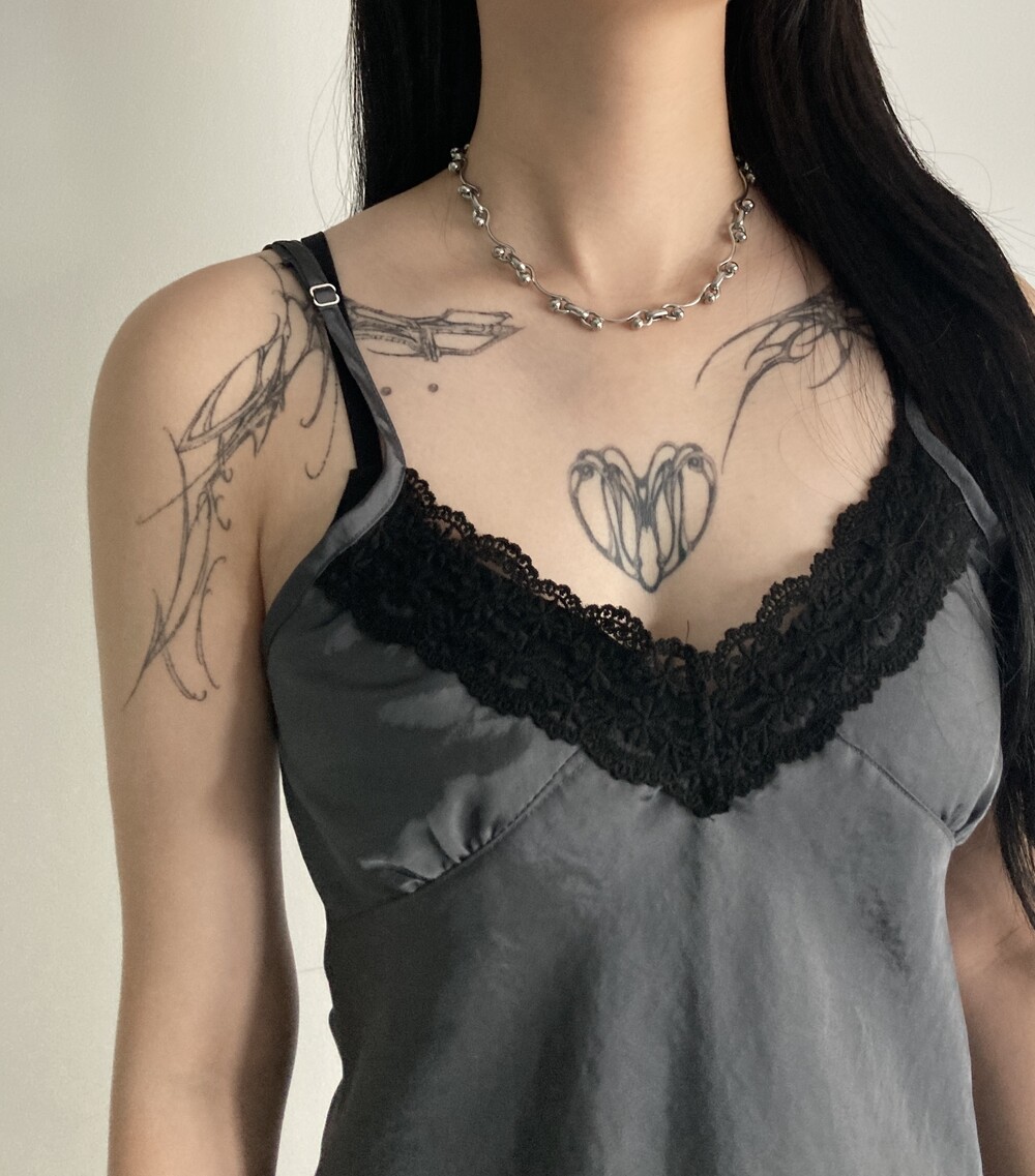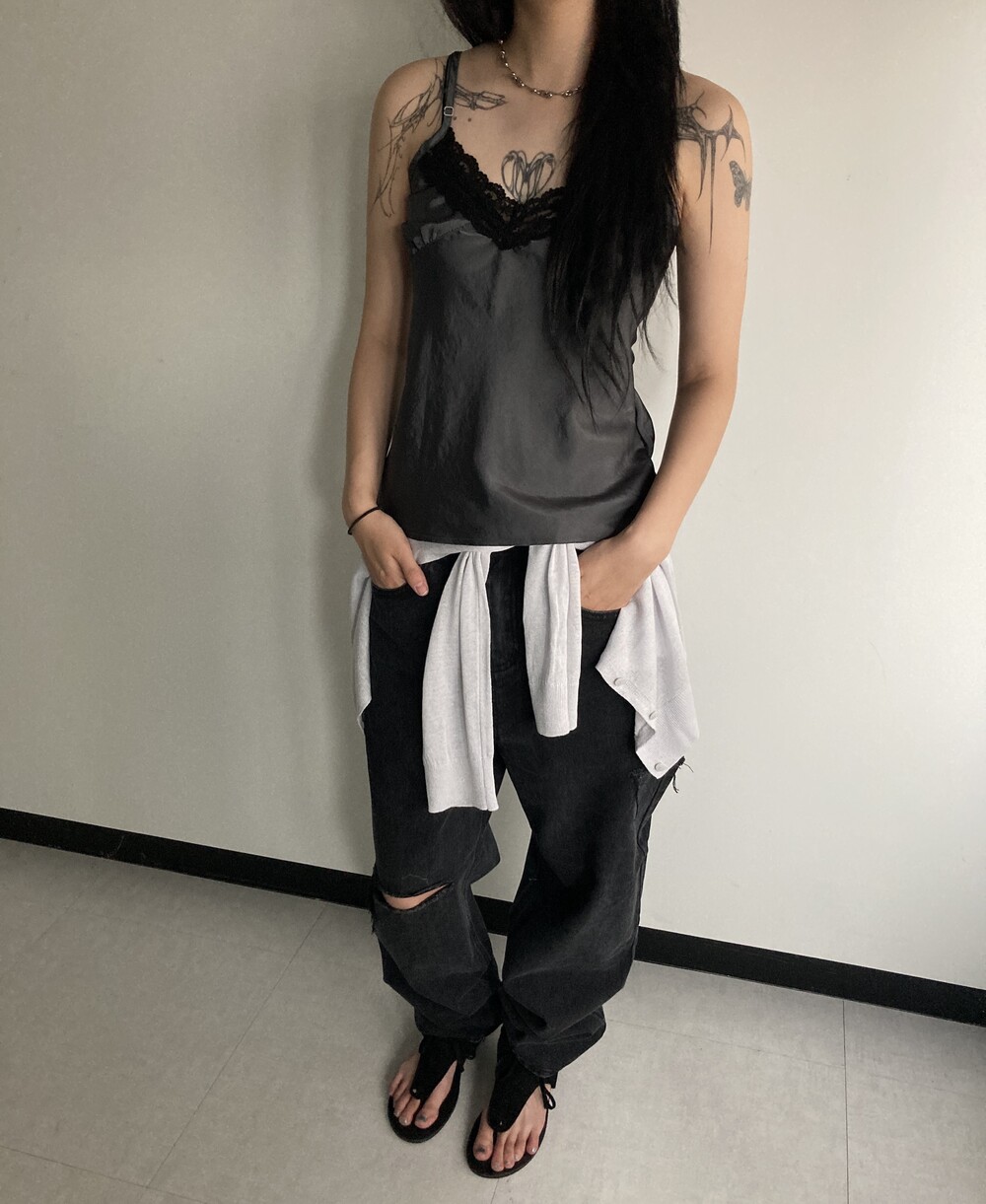 - 광택감있는 새틴소재와 상반되는 퍼석한 레이스 디테일.