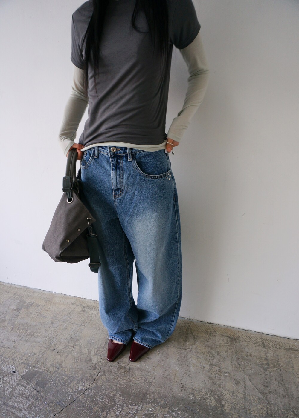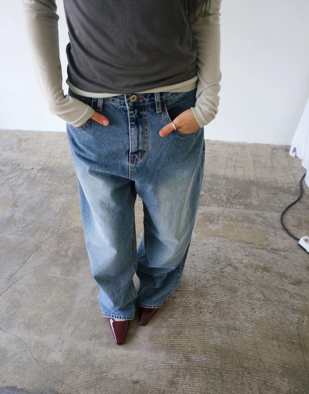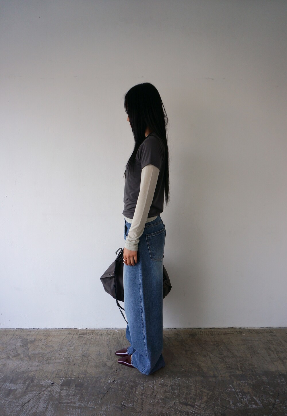 - 긴 밑위 길이 그대로 보이게 골반에 걸쳐입는 매력.