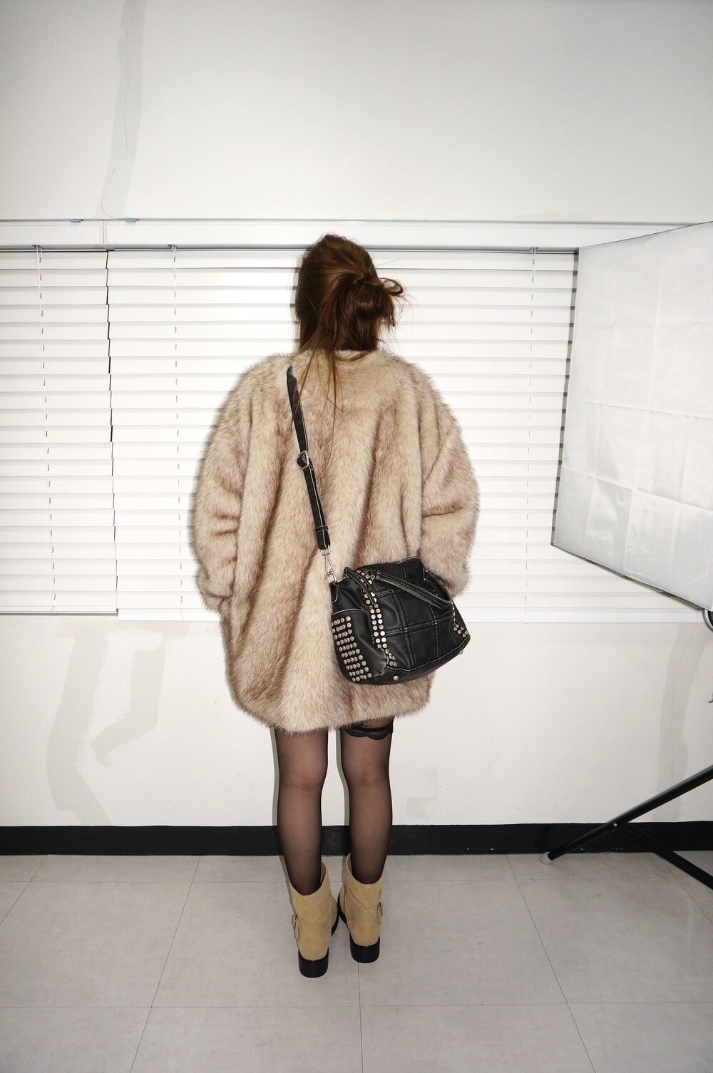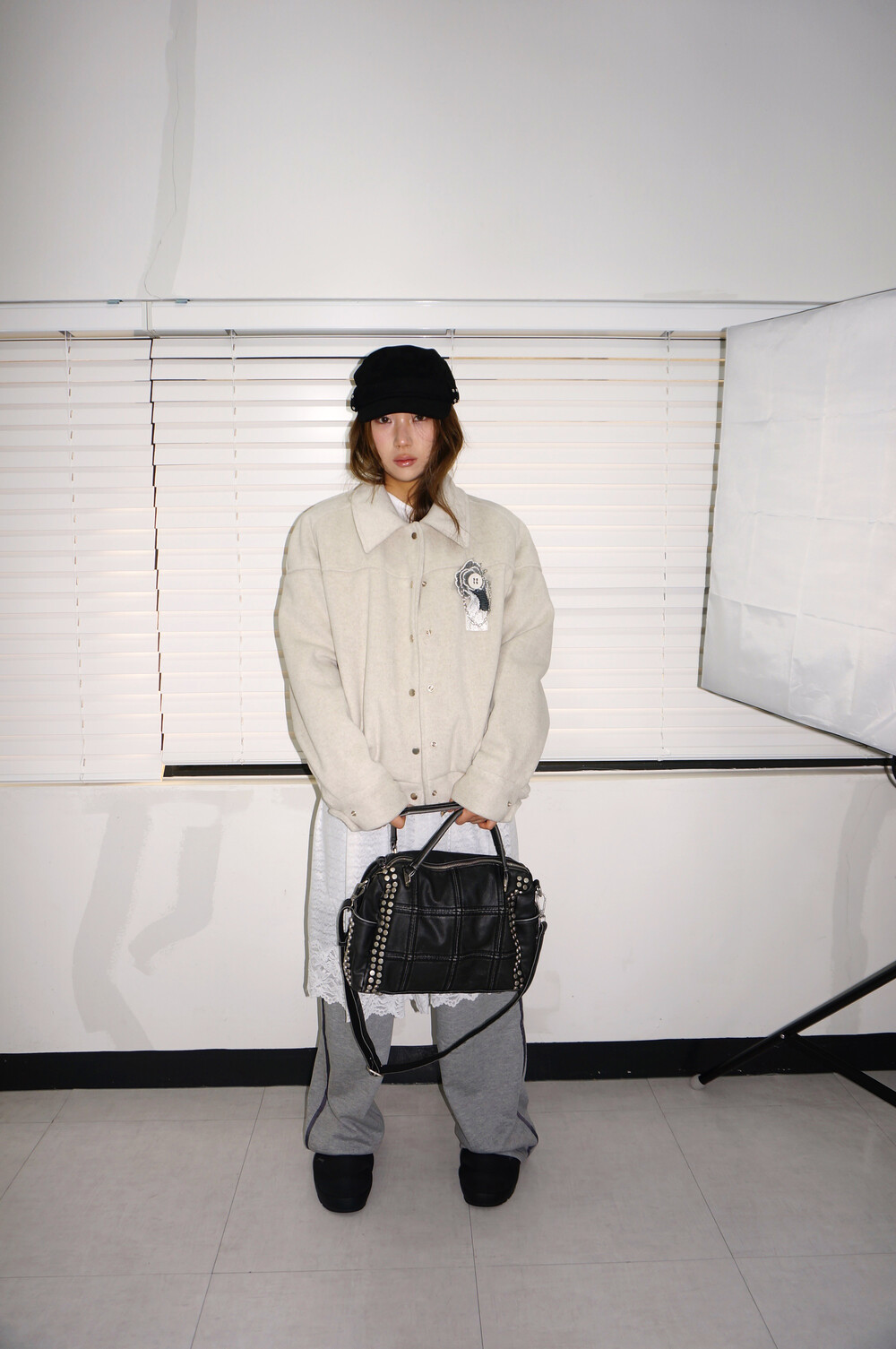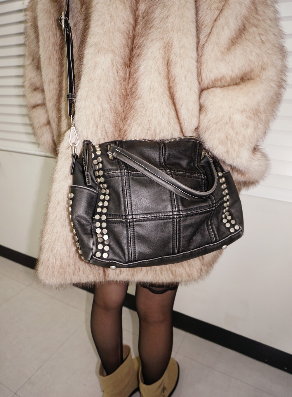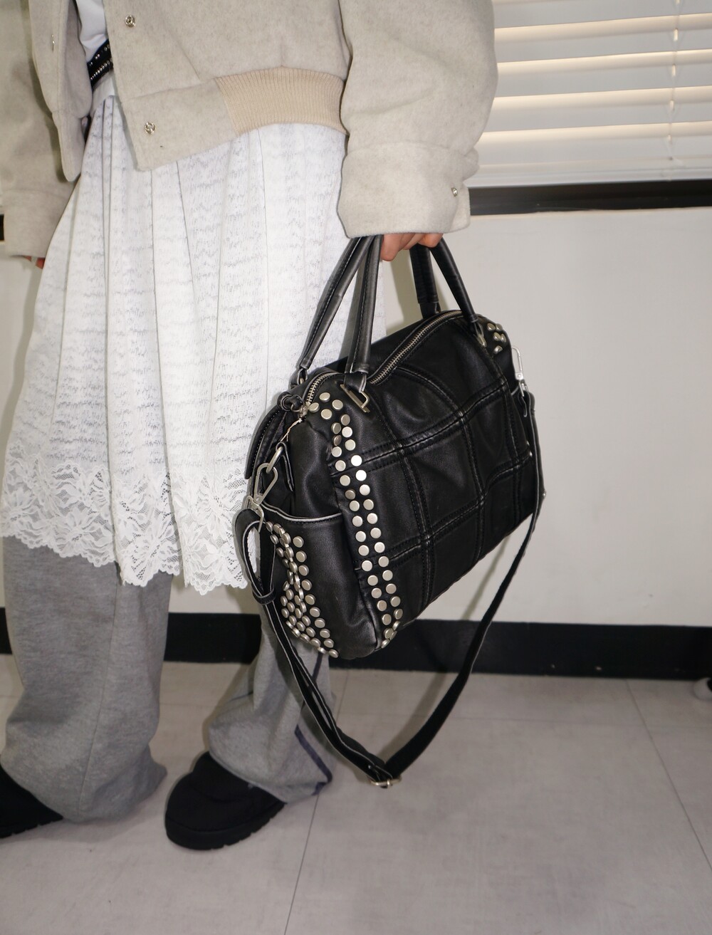 - 스터드, 스퀘어 스티치 디테일의 백.