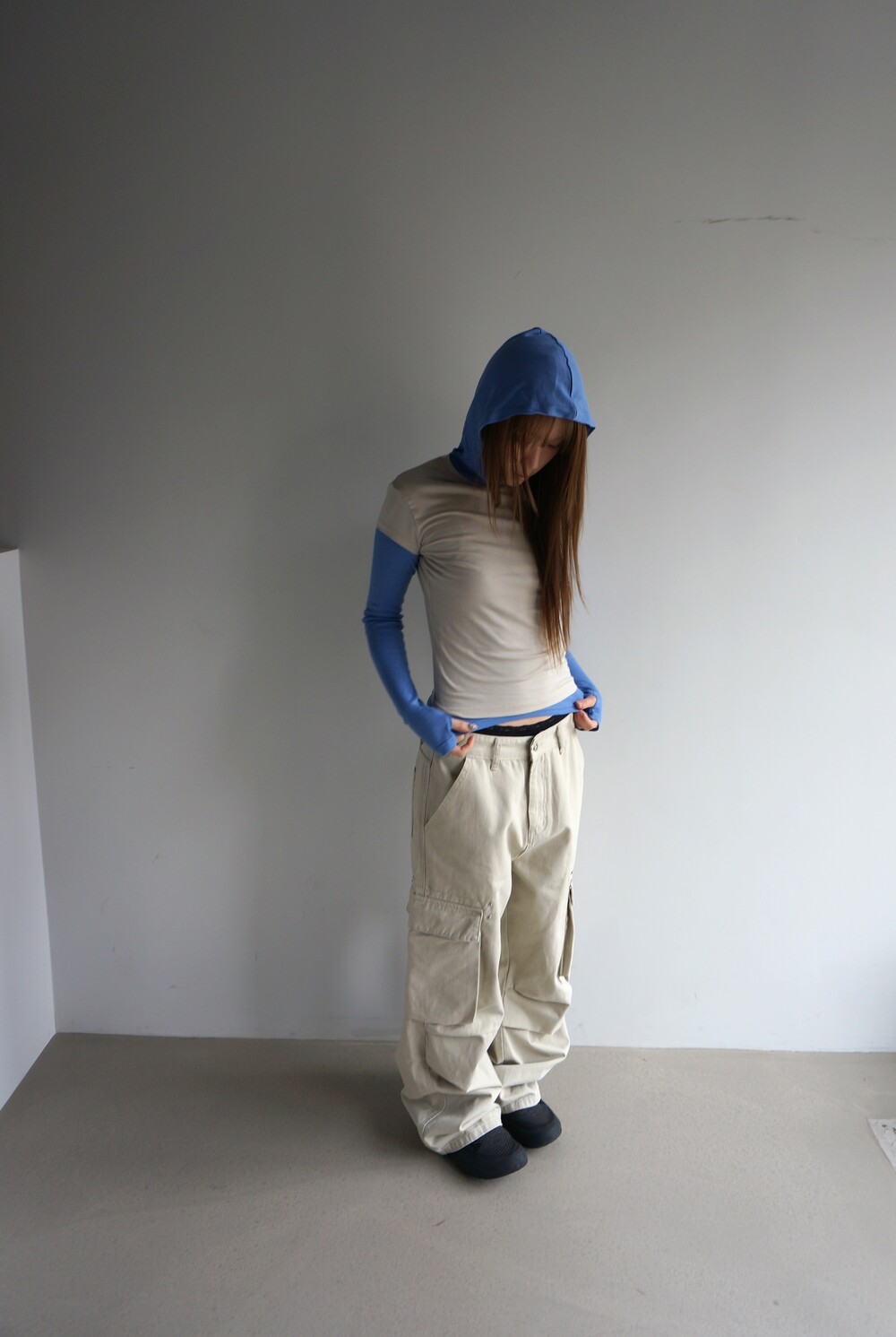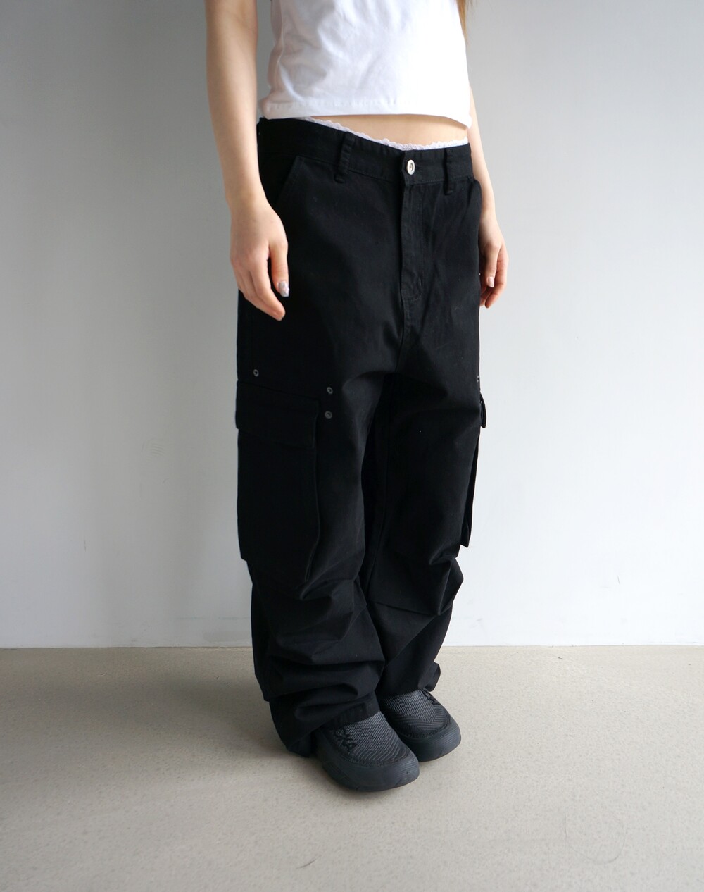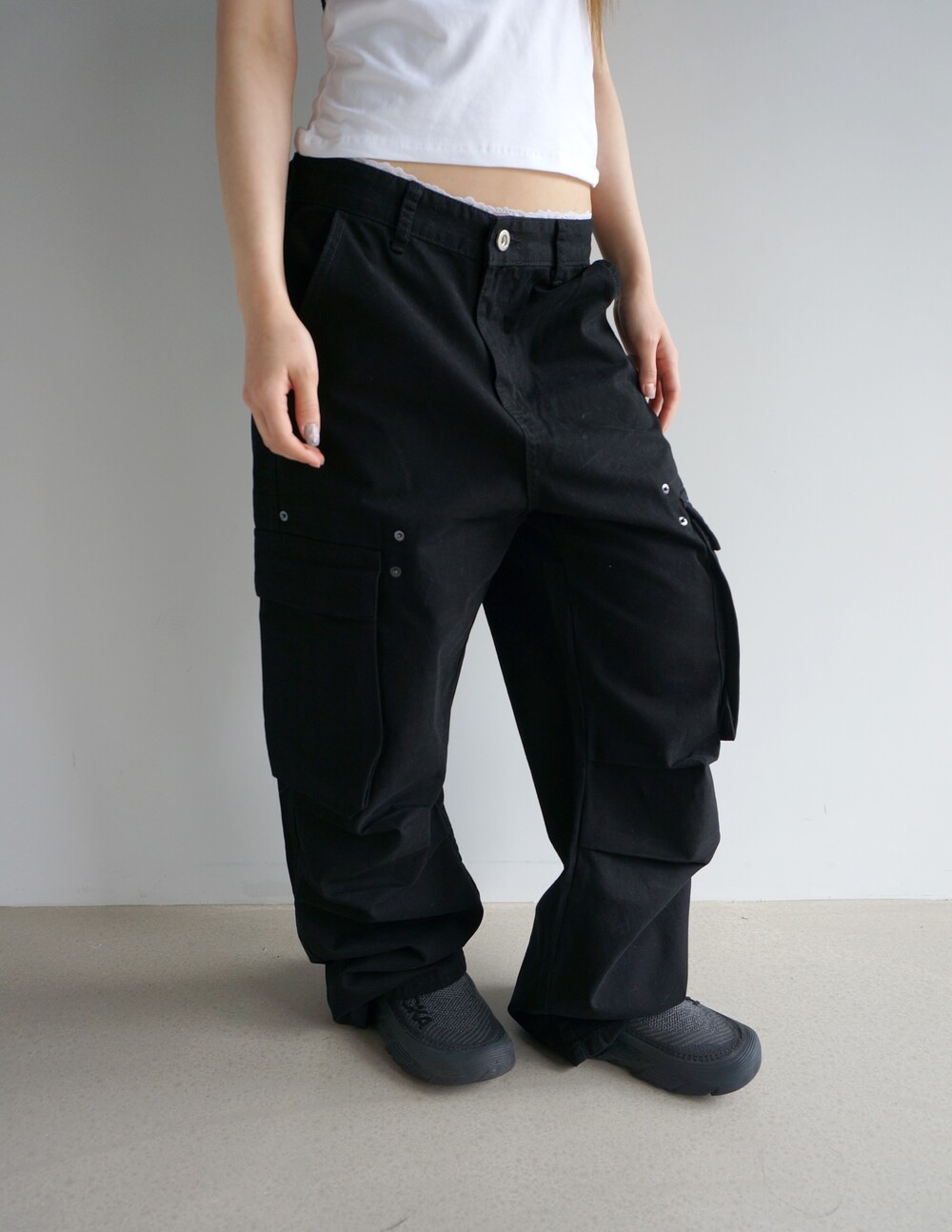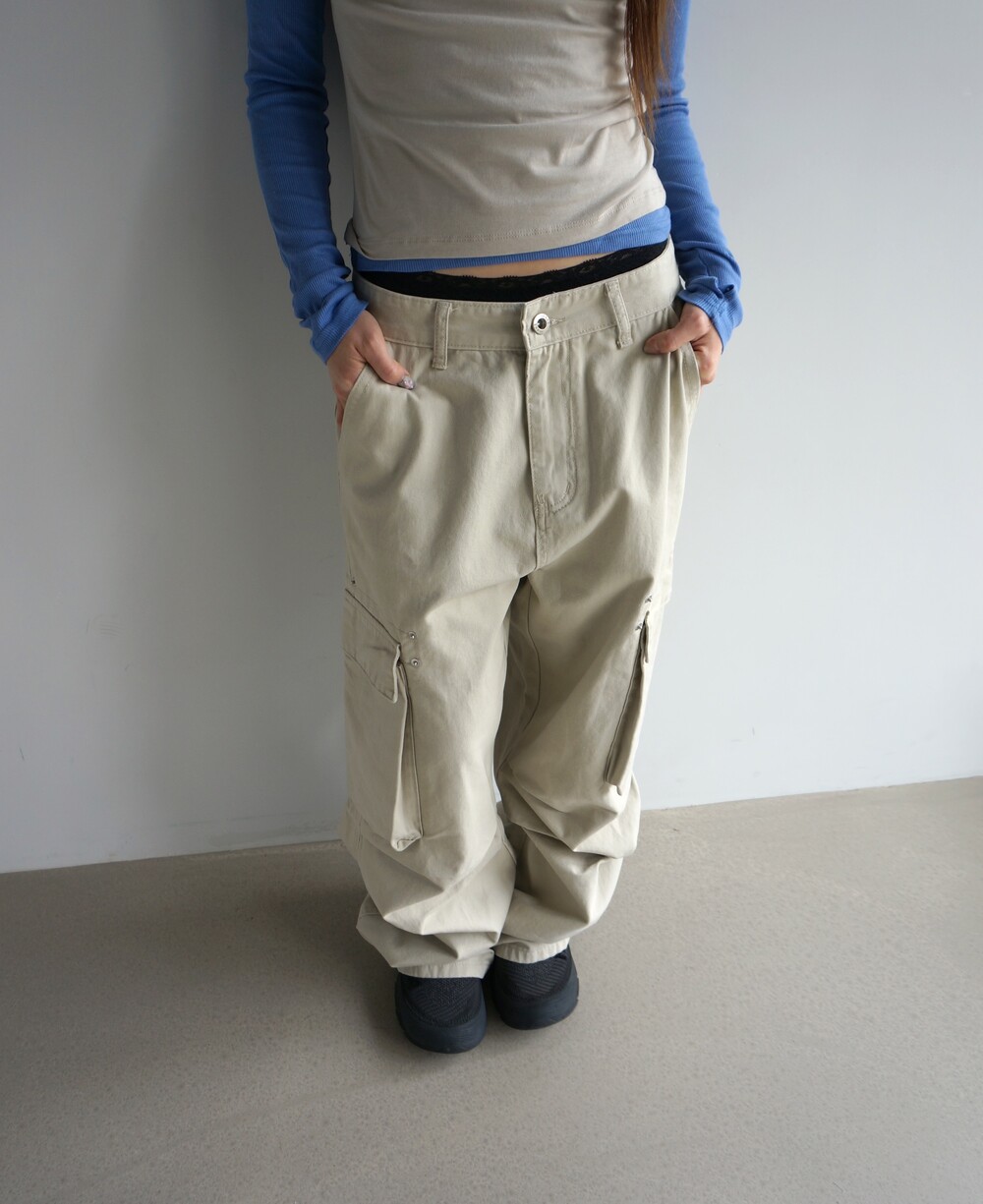 - 포켓 주변 리벳디테일의 파라슈트팬츠.