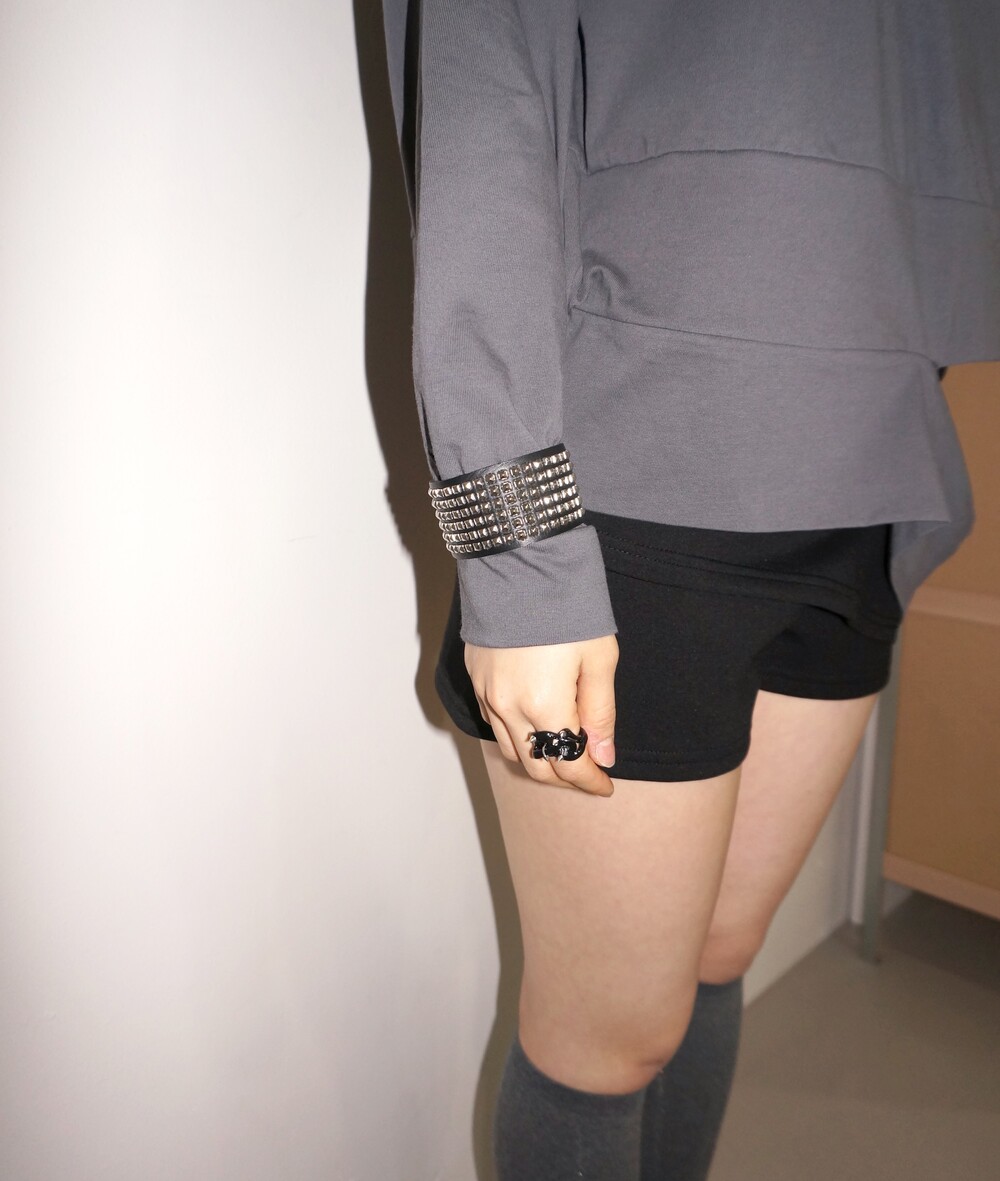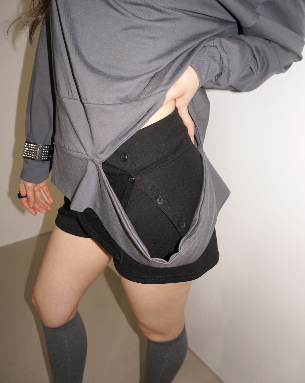 - 단추로 트임 조절이 가능한 스커트 쇼츠.