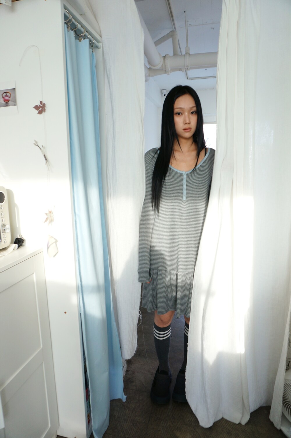 - 얇은 배색 스트라이프 패턴의 원피스.