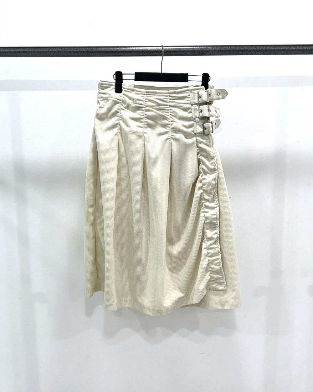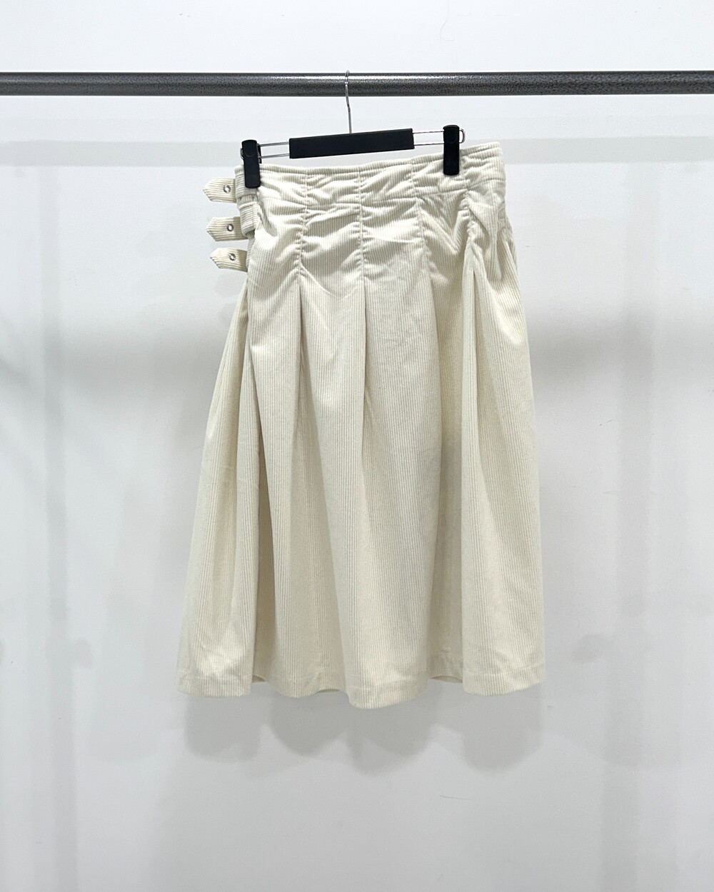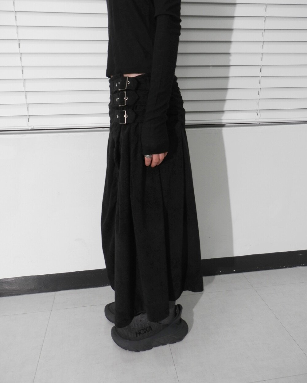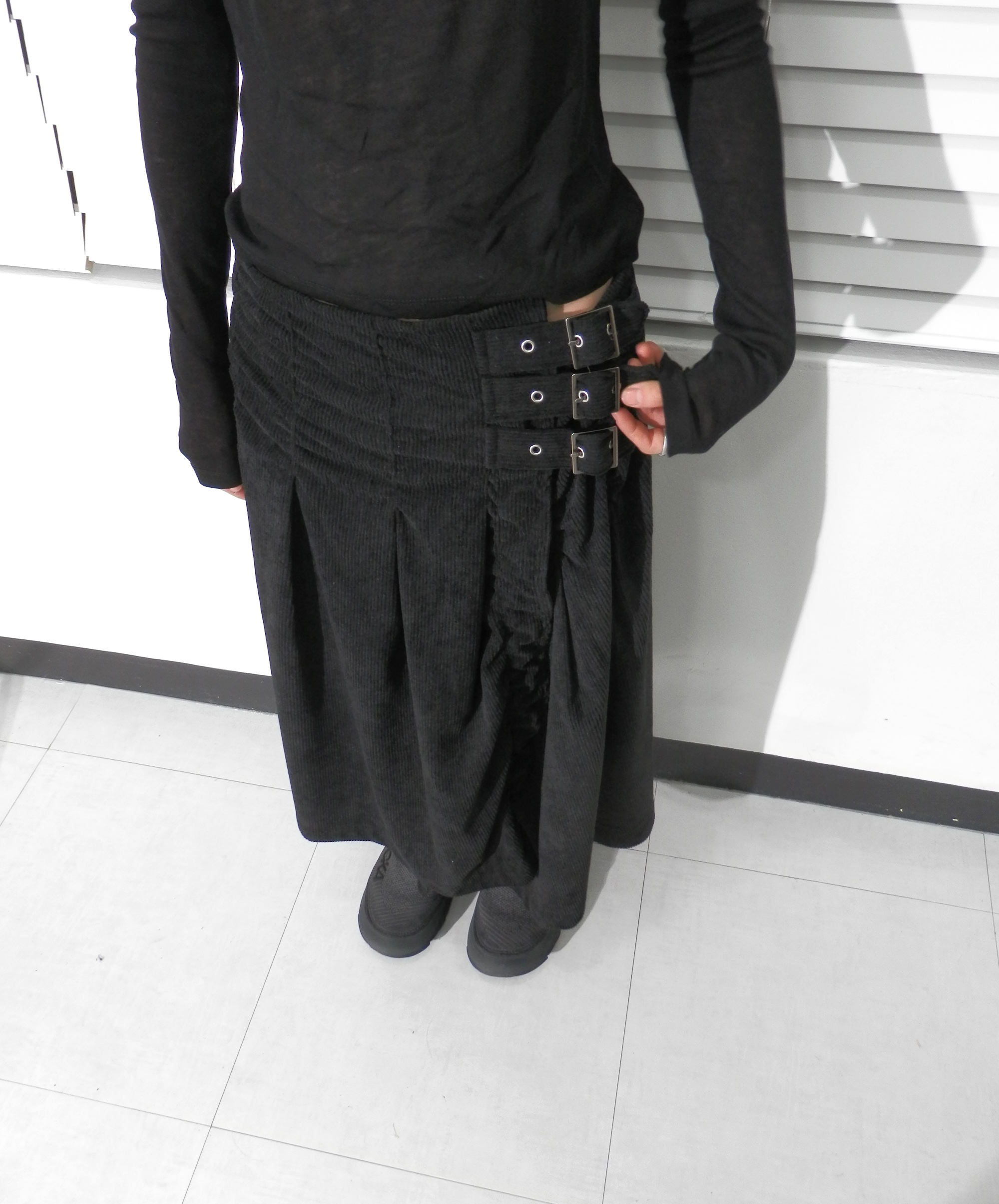 - 허리 옆면 3개의 벨트 디테일의 롱스커트.